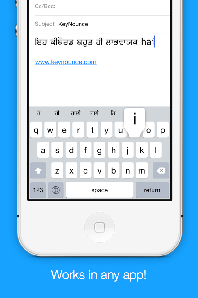 KeyNounce works in any app! Once you enable the keyboard you’ll be able to easily compose texts, emails, tweets, facebook posts, and search the web in Punjabi.
