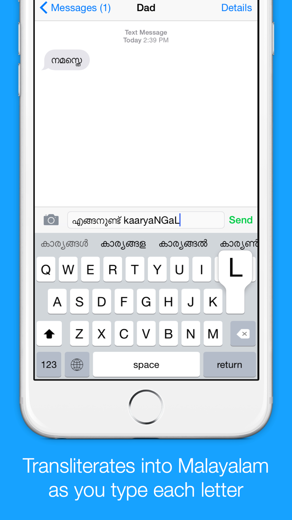 KeyNounce works in any app! Once you enable the keyboard you’ll be able to easily compose texts, emails, tweets, facebook posts, and search the web in Malayalam.
