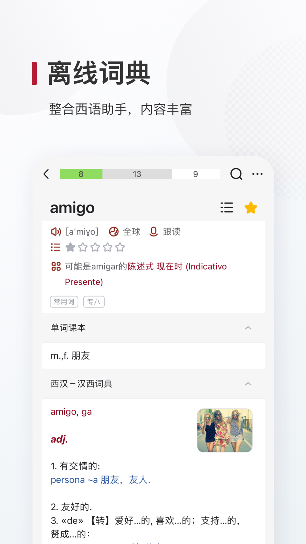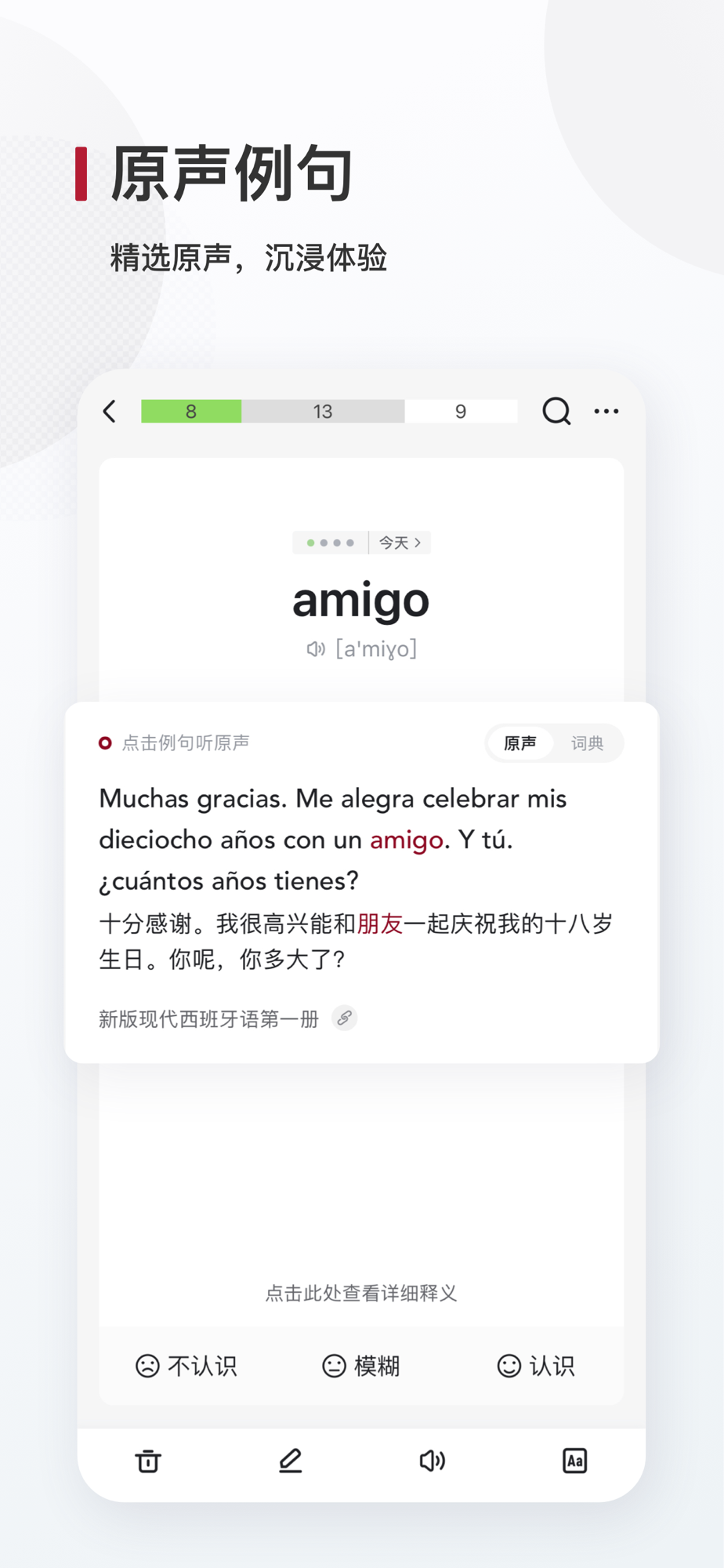 西语背单词是专为西班牙语学习者设计的背单词软件。海量原声例句搭配艾宾浩斯记忆法,助你在了解单词真实语境的同时,科学高效的背单词。