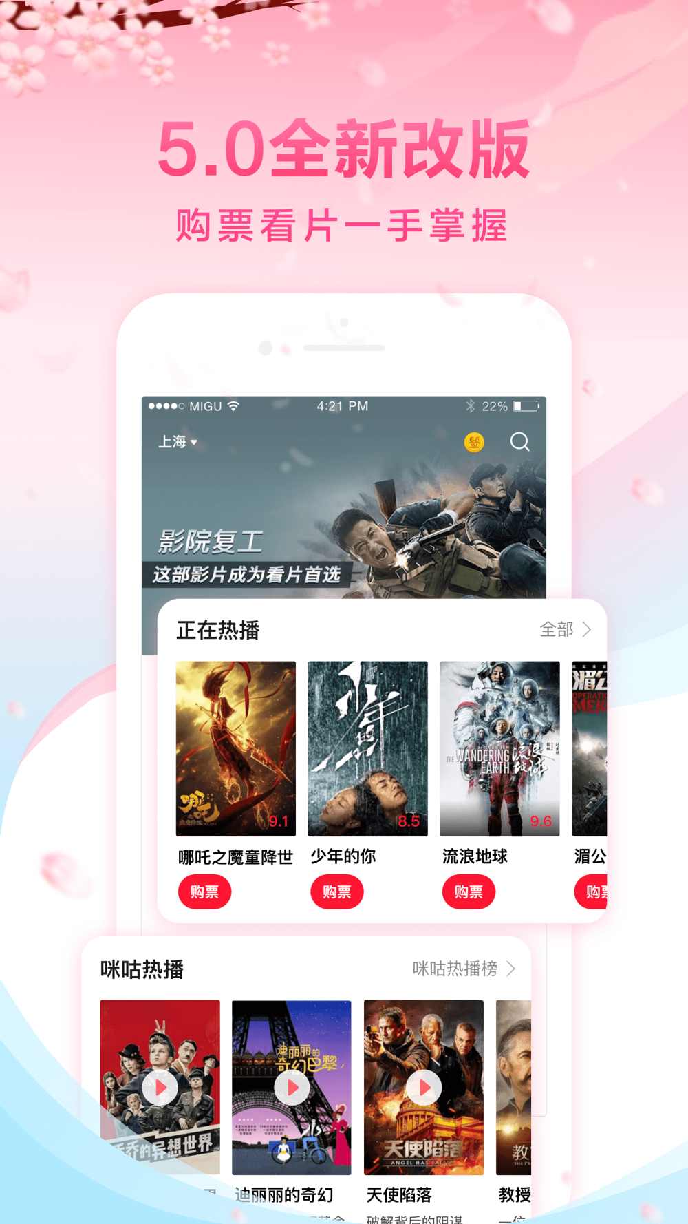 关于电影的一切,一款咪咕影院APP就能满足所有需求!想去电影院看电影?我们为您提供便捷的选座订票方式。想在线点播看电影?我们为您准备了近万部高清资源。想跟同好一起品评电影?我们建立了动态广场给你场地表达观点。想按自己的想法分类标记喜欢的影片?我们打造个性影单等你来玩!还可以买到演出票、周边商品、看遍影讯预告、完成不同任务赢取多样奖励……
