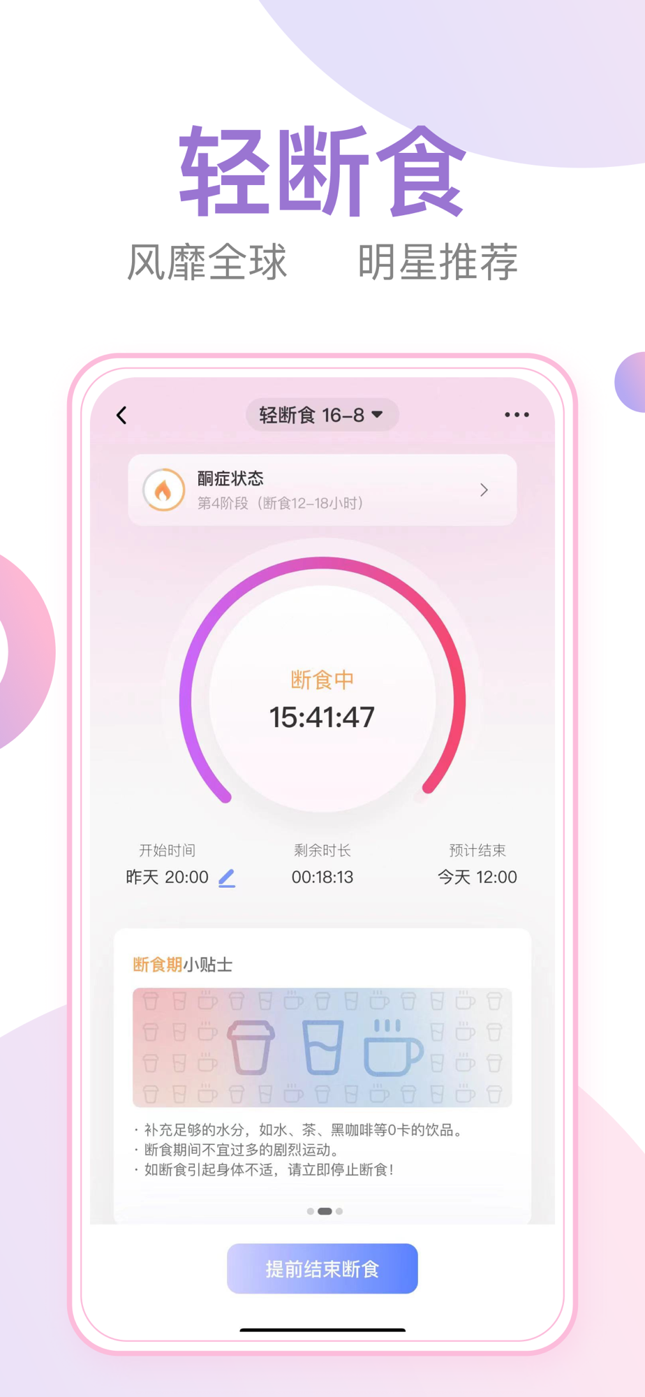 3、轻断食记录:风靡全球的轻断食记录功能,极易上手的入门级减肥法,有16+8、18+6等多种模式供选择