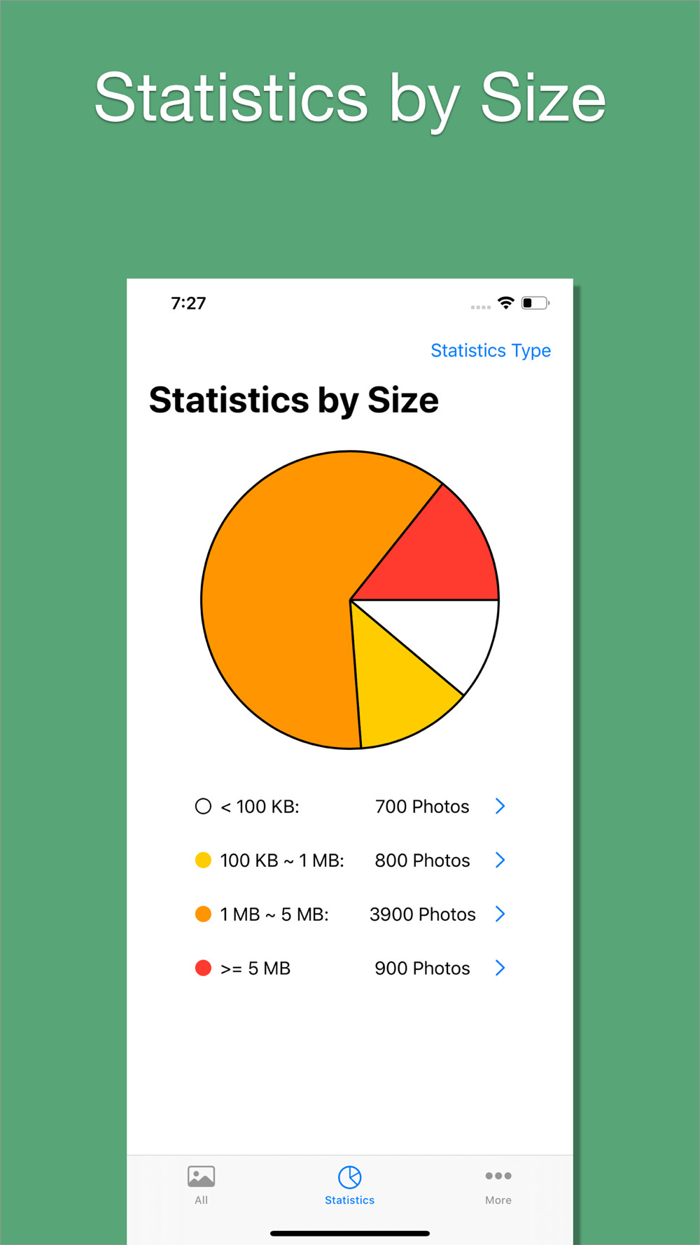 - Browse all images and see the size of each image just below the thumbnail. Different colors indicate different sizes, for example: images larger than 5M are marked in red.