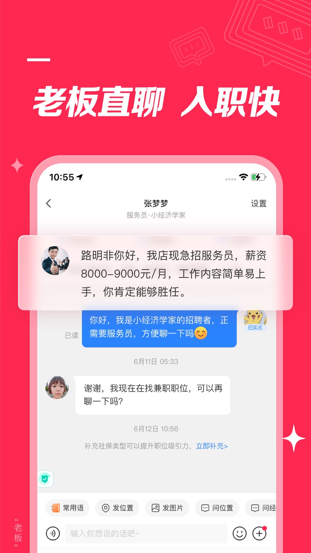 【店长直聘】是一款专门针对服务业免费招聘/找工作的手机软件,根据定位精确匹配附近的好工作和求职者,获得对方联系方式更快捷,在线聊工作,发面试,入职招人更高效!