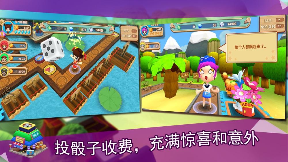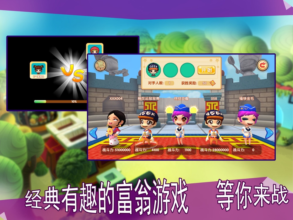 富翁类的经典游戏模式,全新3D效果打造,幽默搞笑、可爱卖萌,一旦上手就根本停不下来啊!一起来做主宰世界的大富翁吧!