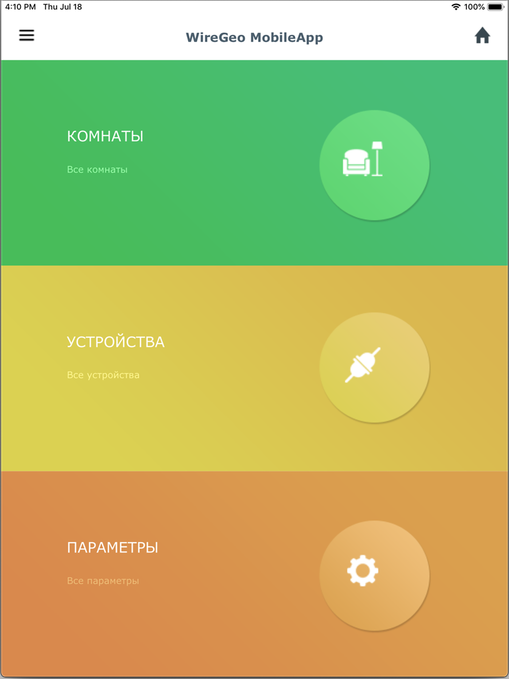 WireGeo App allows you to control your automation in a single tap - be it your smart home, smart building, smart business, etc. - even if you are on the other side of the Earth.