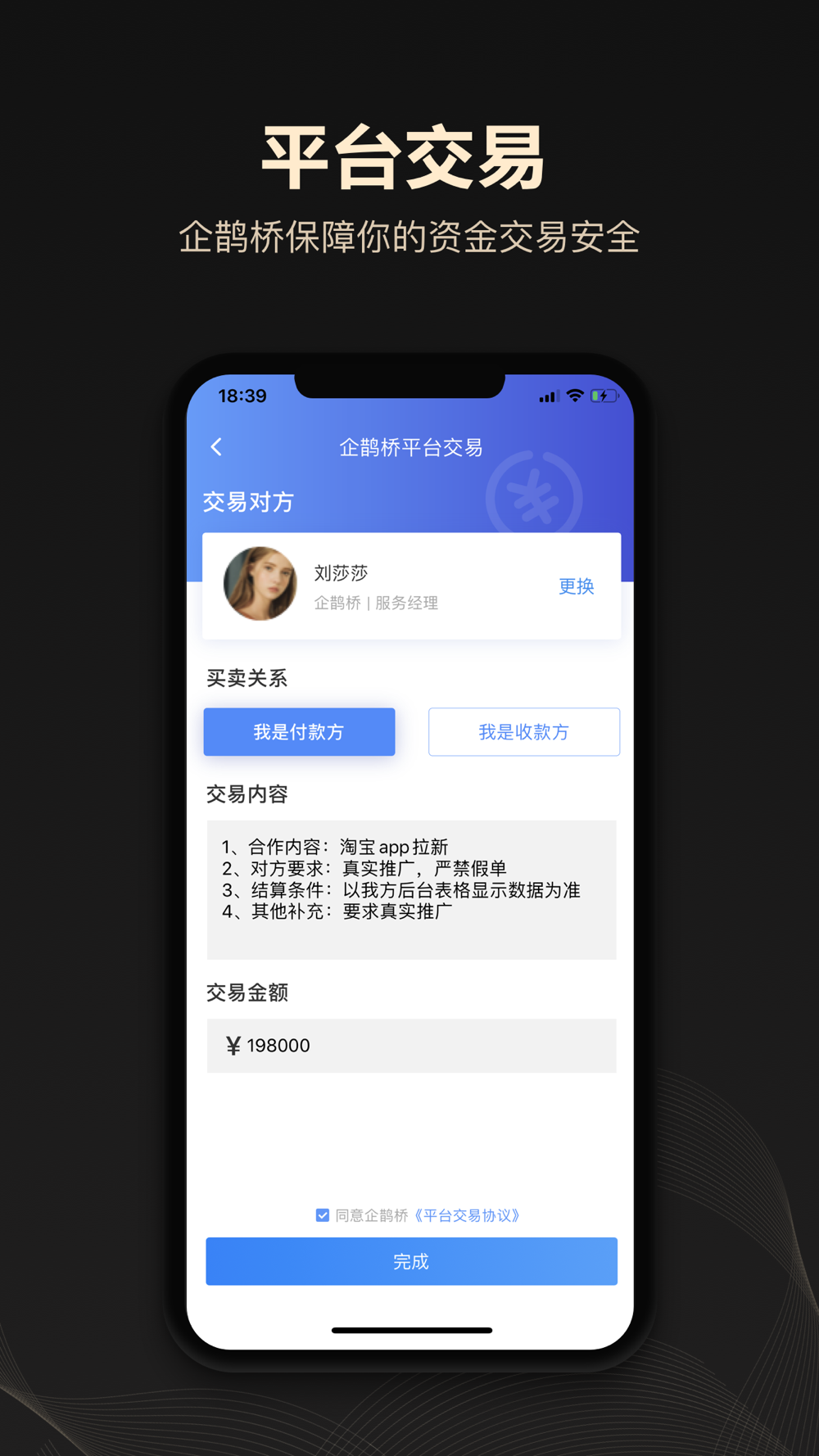 企鹊桥,是一款在线洽谈合作的APP,相比于线下耗时耗力的商务资源拓展,企鹊桥以首创的“合作直聊”模式,为企业商务人士提供了一个高效的合作洽谈平台 。