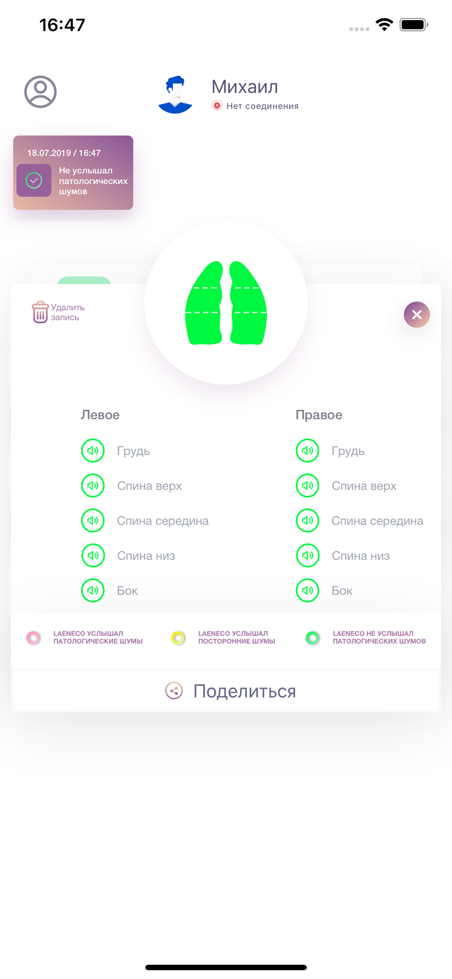 По инструкции в приложении вам необходимо приложить стетоскоп к телу и дождаться сигнала о завершении прослушивания. Цикл измерений занимает от 30 сек до 5 мин в зависимости от выбранного режима.