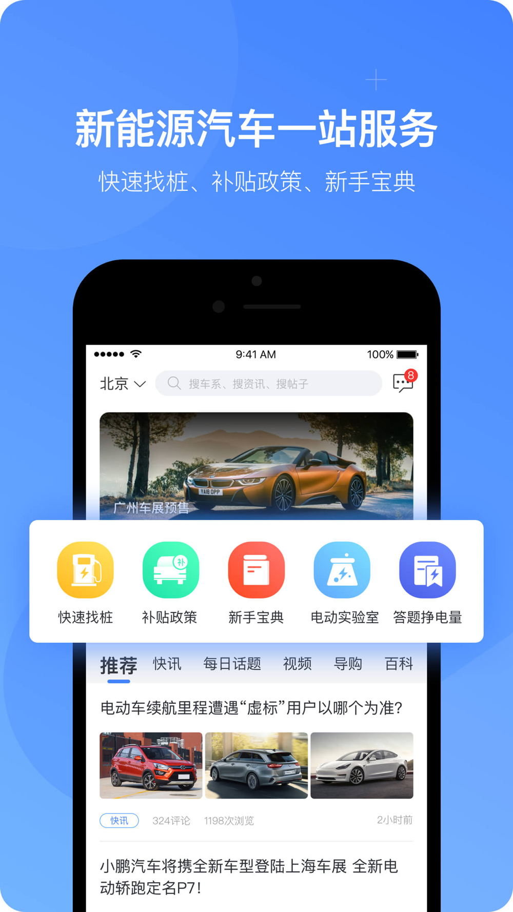新能源汽车一站式平台,专注于为电动新能源车爱好者和车主提供新能源汽车购买和使用指南的专业垂直应用。