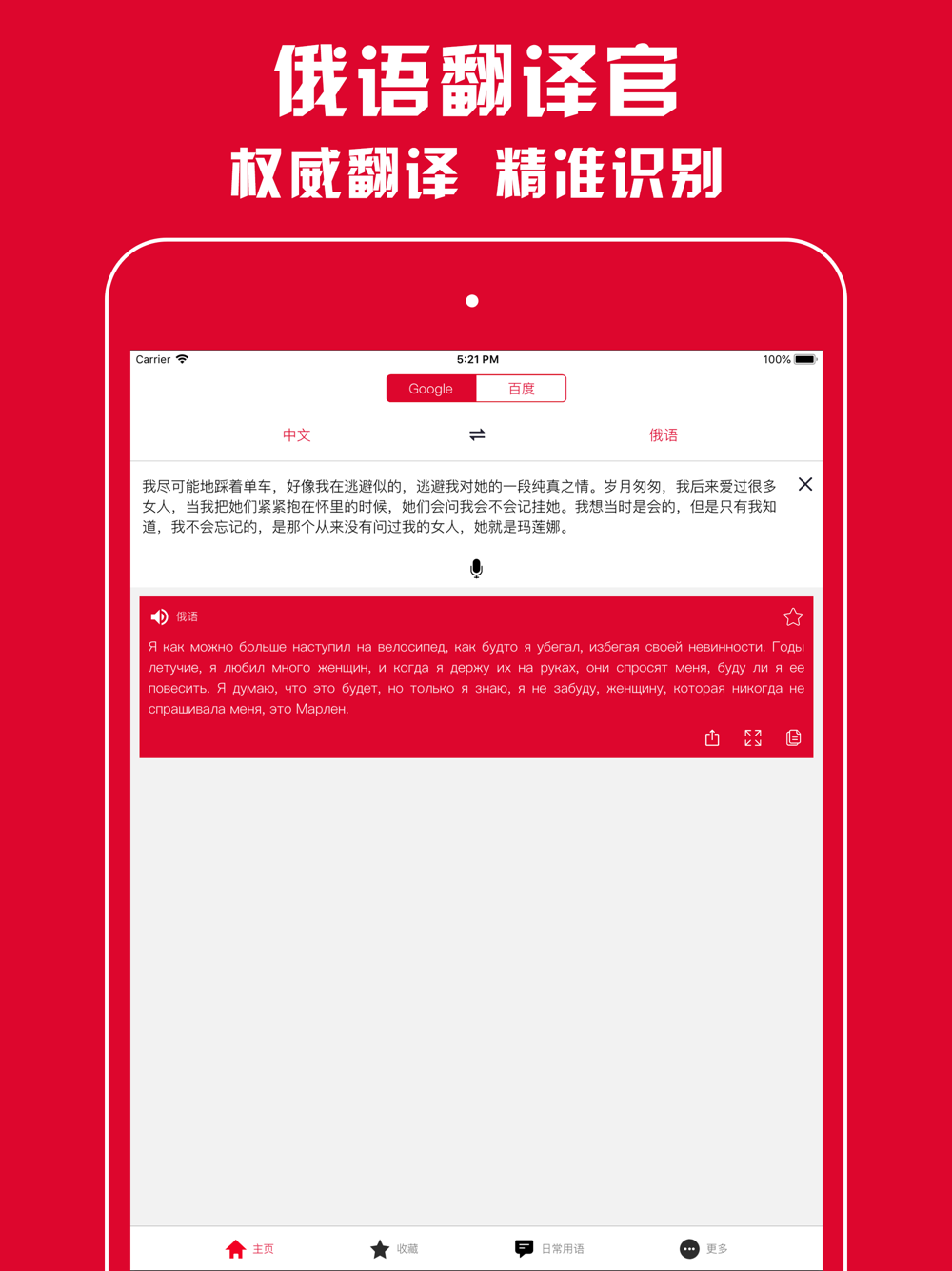 1 | 多平台,更加精准——内嵌多个顶尖翻译平台,给您更多翻译结果比对参考,精准极速地道的中俄互译