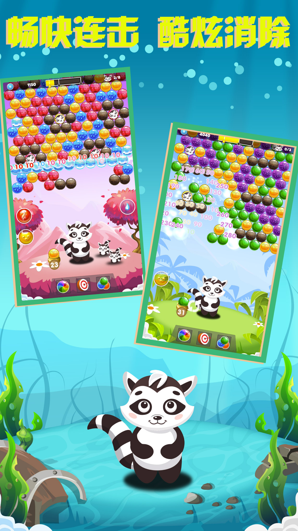 浣熊泡泡龙是一款画风激萌、操作简单的休闲益智类泡泡龙游戏,通过消灭泡泡,解救浣熊宝宝!