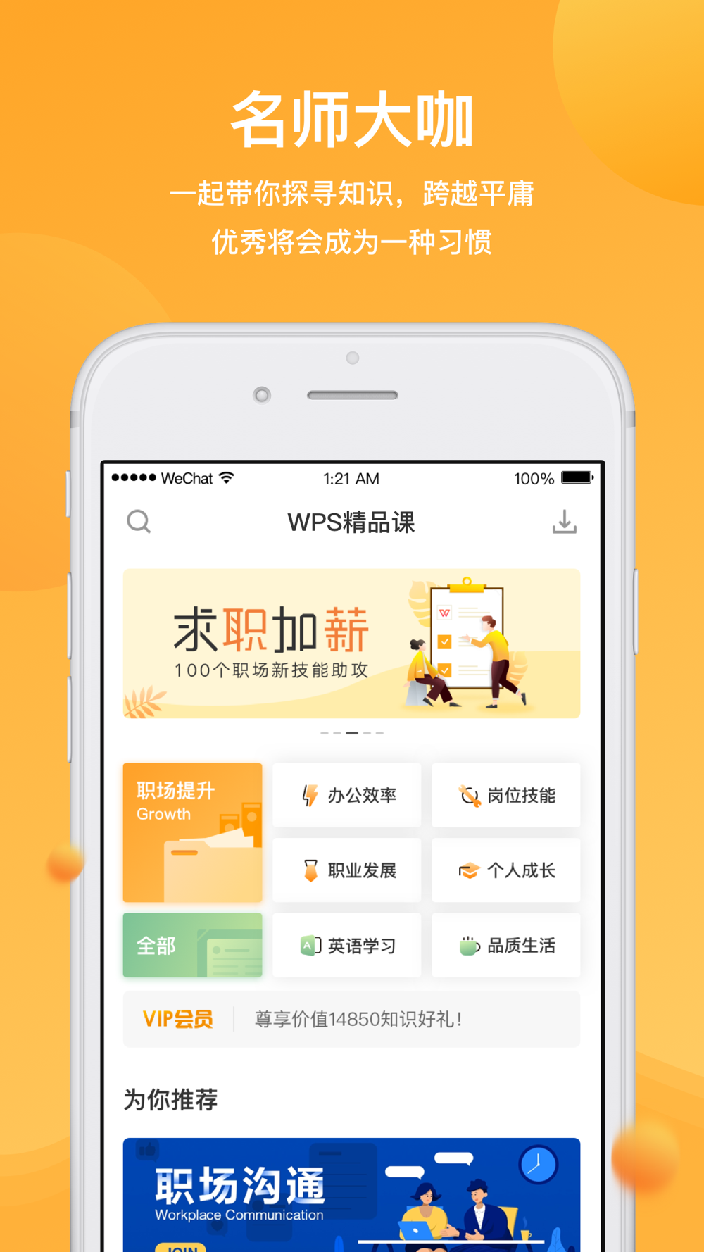 WPS精品课APP是一款专为职场人士提供优质内容平台。涵盖职场办公效率、岗位技能、职业发展、个人成长、英语学习、品质生活等诸多精选内容,为每个职场人士提供优质的方法论来帮助大家解决问题。