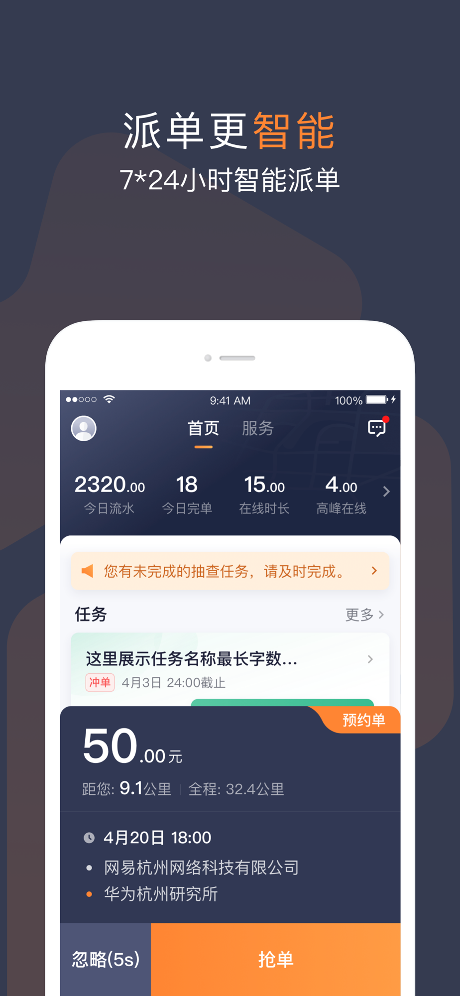 海量订单7*24小时智能派单,不愁没单抢,派单无倾斜,单单都公平。