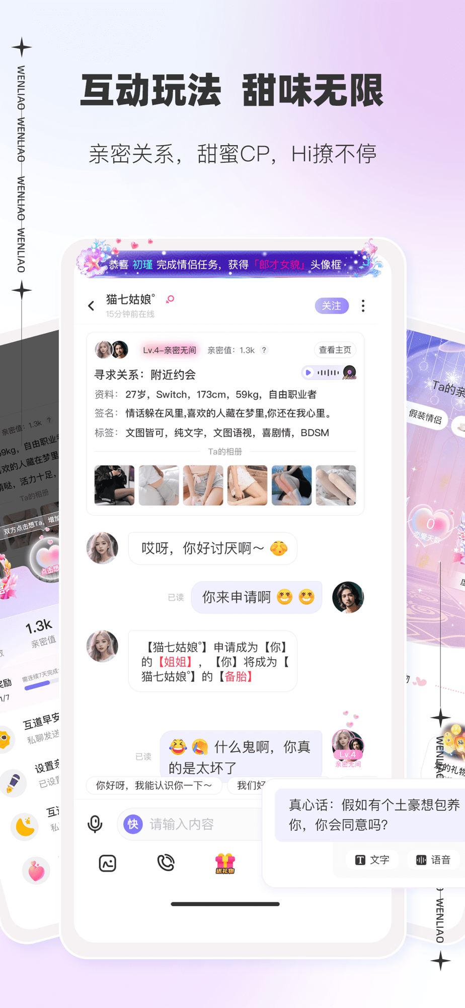 文撩支持建立各种有趣的亲密关系,男朋友/女朋友,备胎,闺蜜,秘书,女仆,爸爸等搞怪好玩的亲密关系,支持自定义关系名称,好玩不停~~