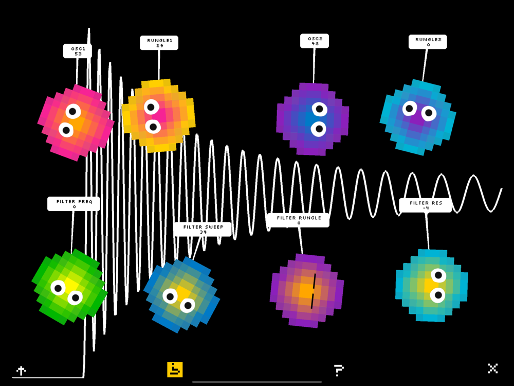 Cryptozoologic is based on Fluxly technology, a musical physics looper where you create new instrument scenes by moving and spinning colorful Fluxum sound sample players. Cryptozoologic expands on Fluxly (fluxly.com), where the Fluxum controls can also be constrained as sliders, or act as inputs based on their on-screen coordinates.
