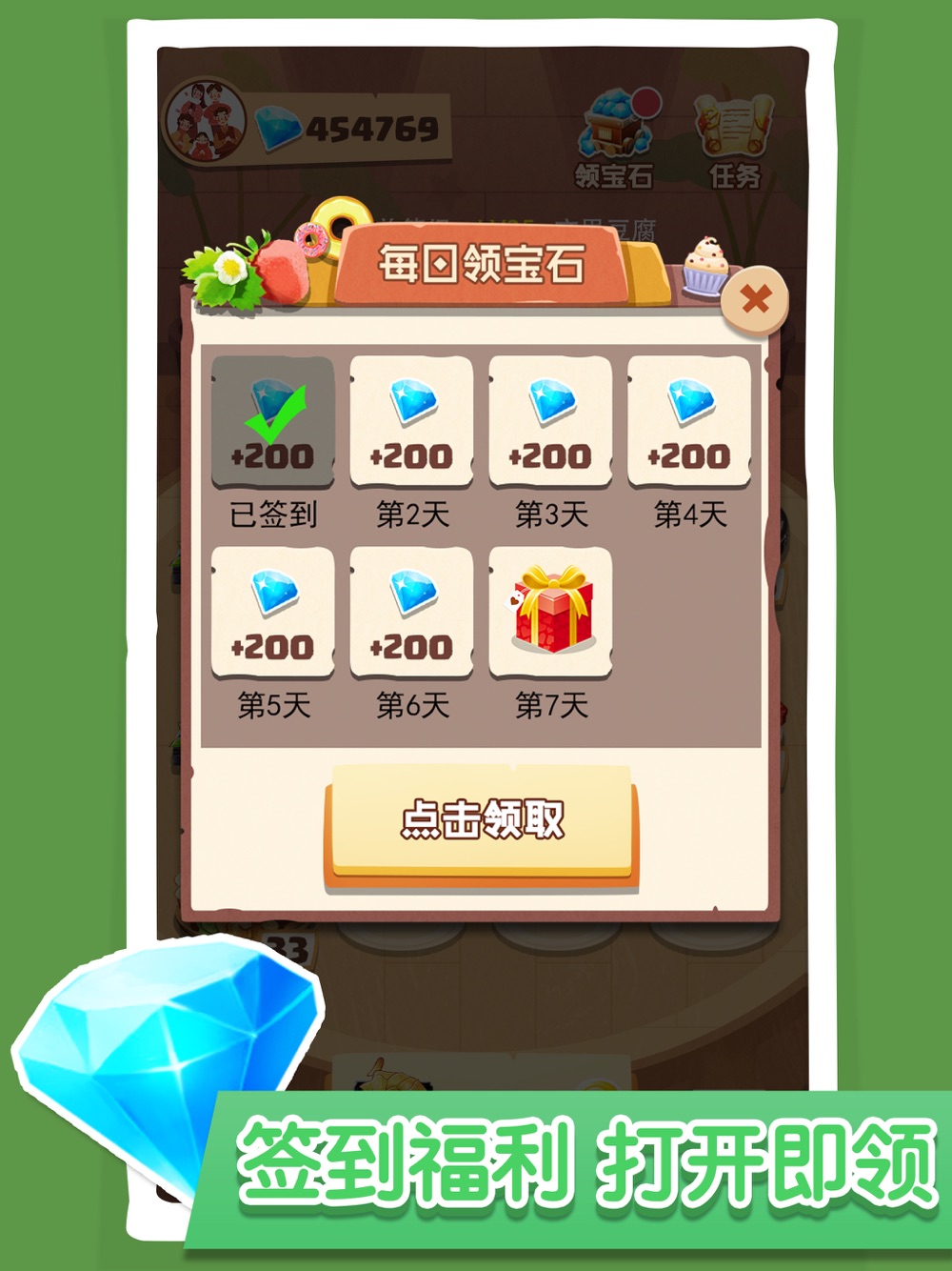 通过合成的方式可以解锁新的美食餐点,桌上的餐点能持续带来收益,循环往复解锁更多的美食餐点,完成游戏当中设置的各种福利任务,还可以领取到丰厚的奖励。