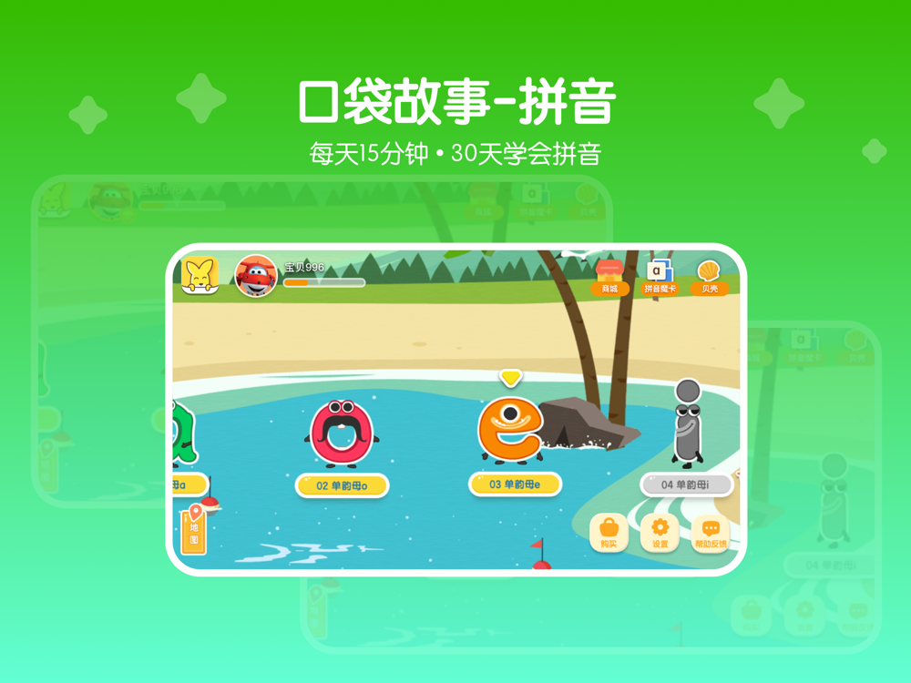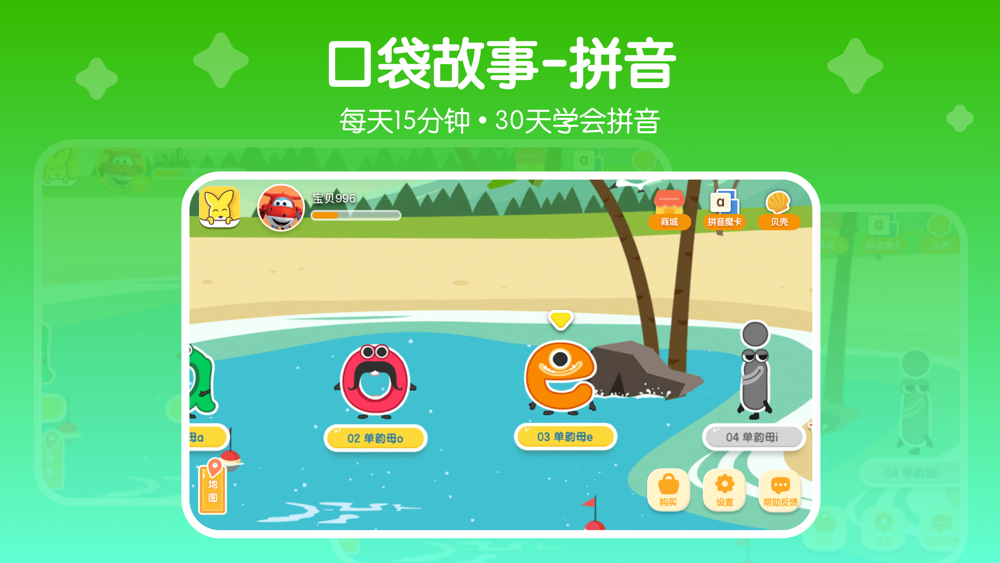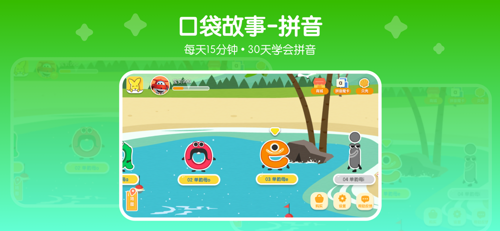 口袋故事-拼音是“口袋故事”旗下一个专为3-8岁儿童打造的拼音学习产品。通过线上学习、线下练习、社群共学的模式,打造“教、学、练、用、测”的学习闭环,帮助孩子实现拼音学习的终极目标:会拼读!能阅读!