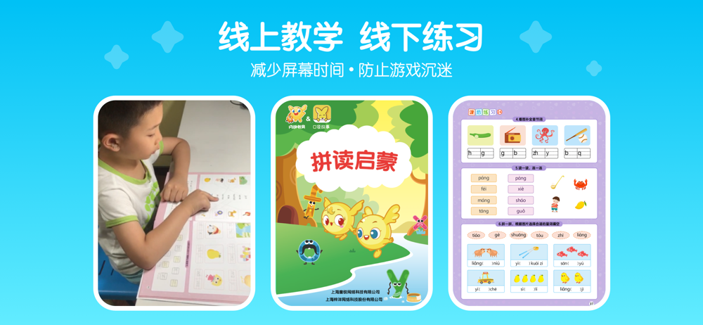 比“功能性游戏式”学拼音,更注重游戏实体参与感、手机游戏防沉迷 。精密设计的线上学习,在有限时间内达到最好的教学效果,同时结合有趣好玩的线下练习,巩固学习效果。