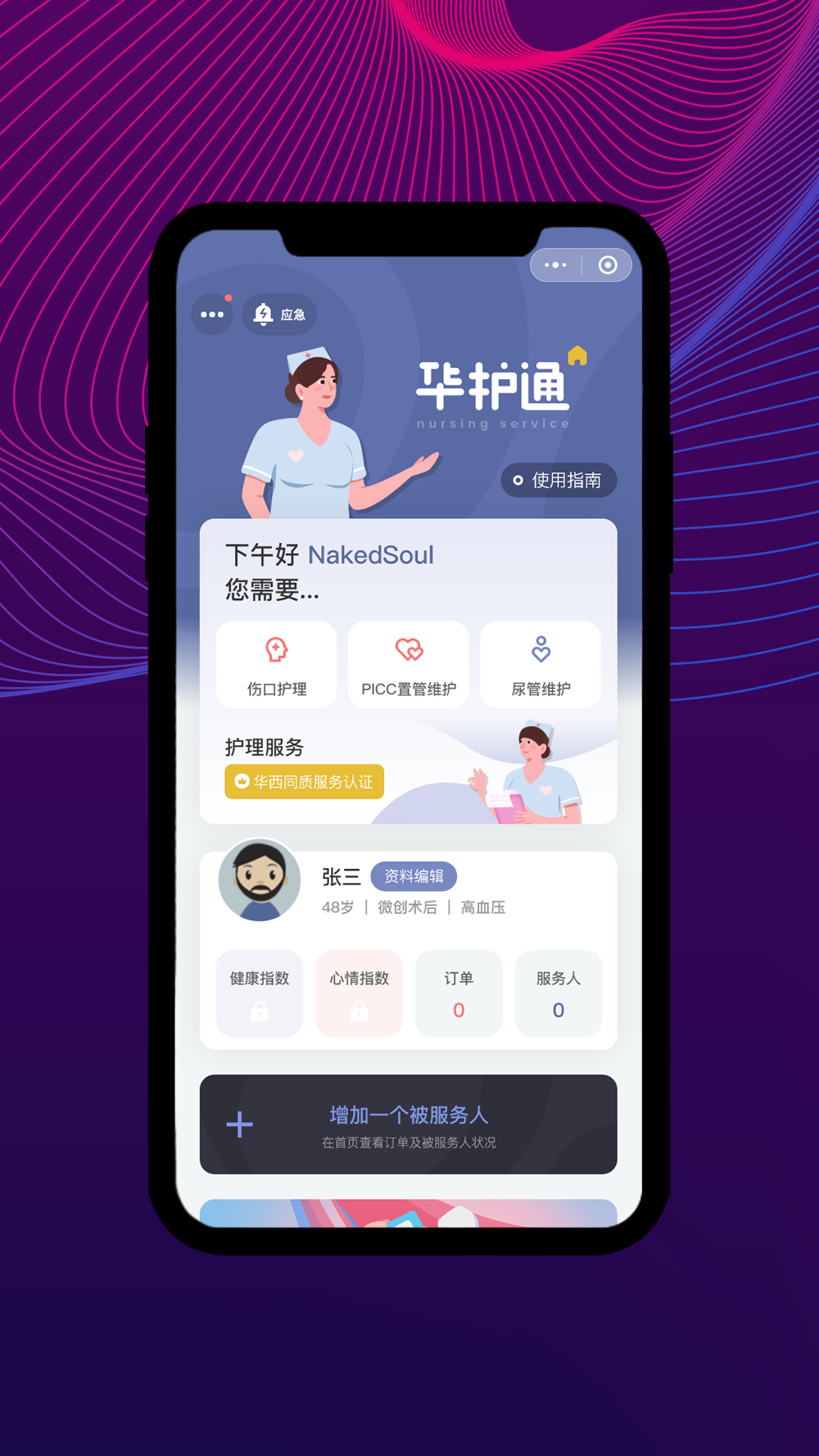 【护理服务】:支持执业护士上门或者前往合作医疗机构,为预约患者开展伤口换药、胃管护理、尿管护理等日常护理项目。