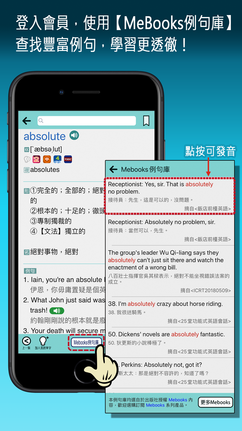 當您查完單字,想查看更多例句時,可以登入MeBook會員,運用【Mebooks 例句庫】查找和該字詞相關的豐富例句,學得更通透。同時也能練習[英單檢測],測試一下自己擁有的單字力。