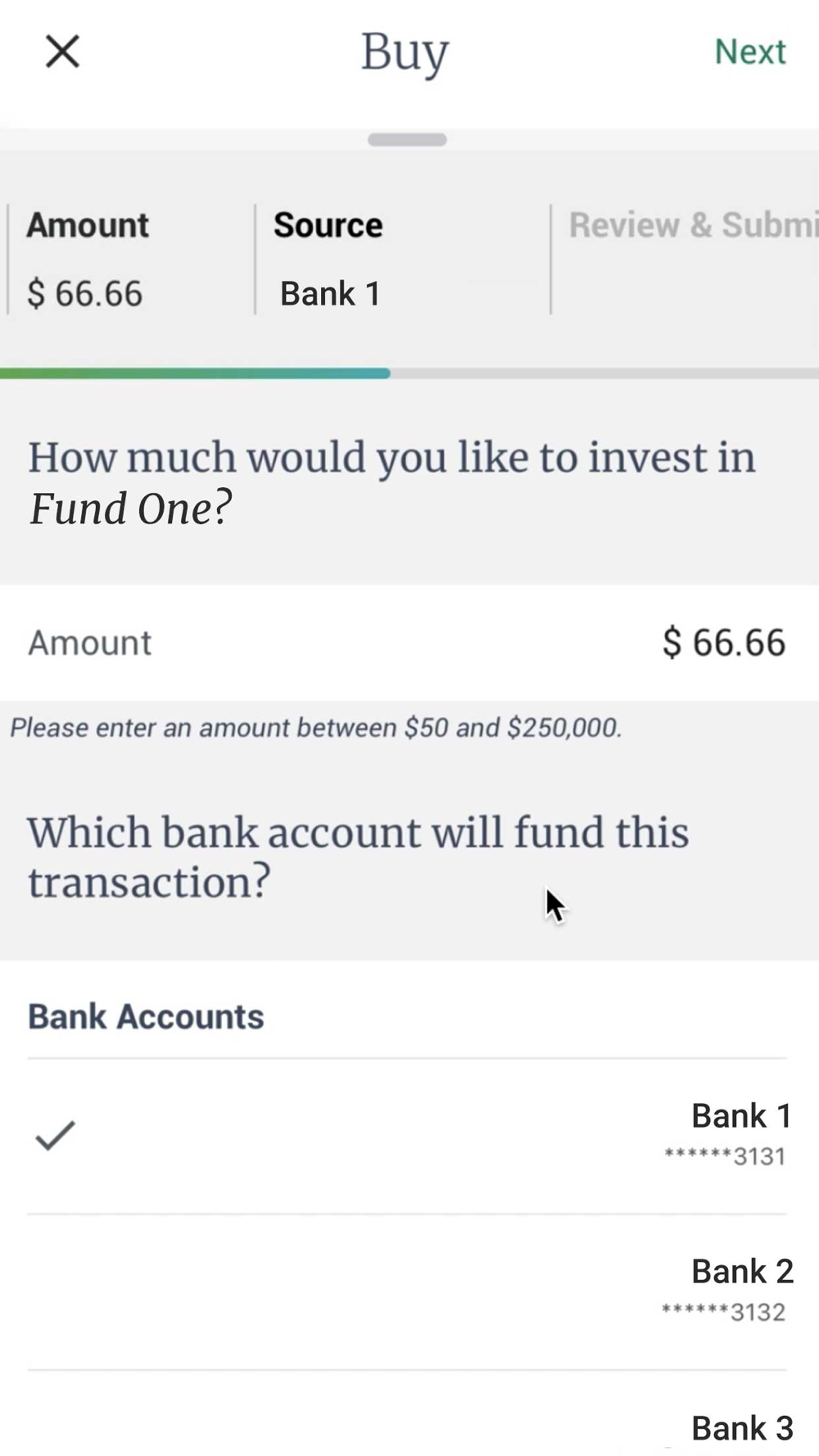 • Select “Buy” for the fund for which you want to purchase shares, key in amount, and choose your bank.
