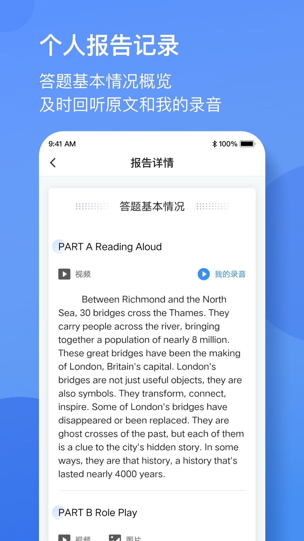 2.答题记录:训练完成实时保存学生语音数据,共学生查看历史记录,便于自我检查和回顾。