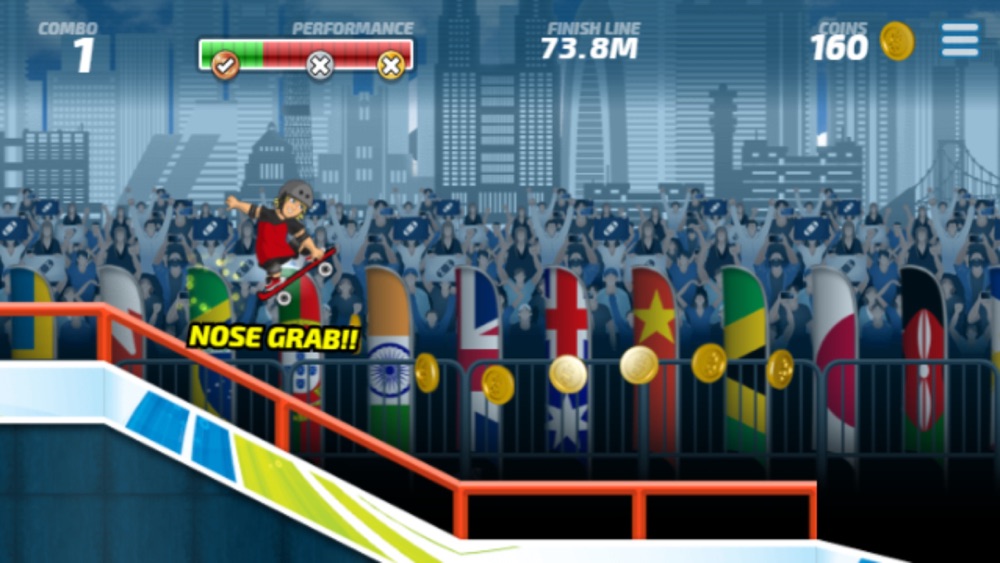 1.玩家在游戏中控制滑板车选手,跨越各种障碍,达到终点后就可以进入到下一个关卡。