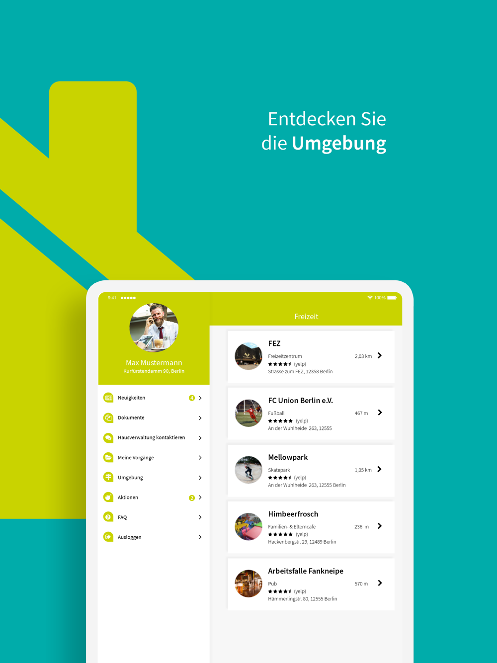 Informieren Sie sich z.B. über Geschäfte, Ärzte, Erstatten und über die Öffnungszeiten in Ihrer unmittelbarer Umgebung.