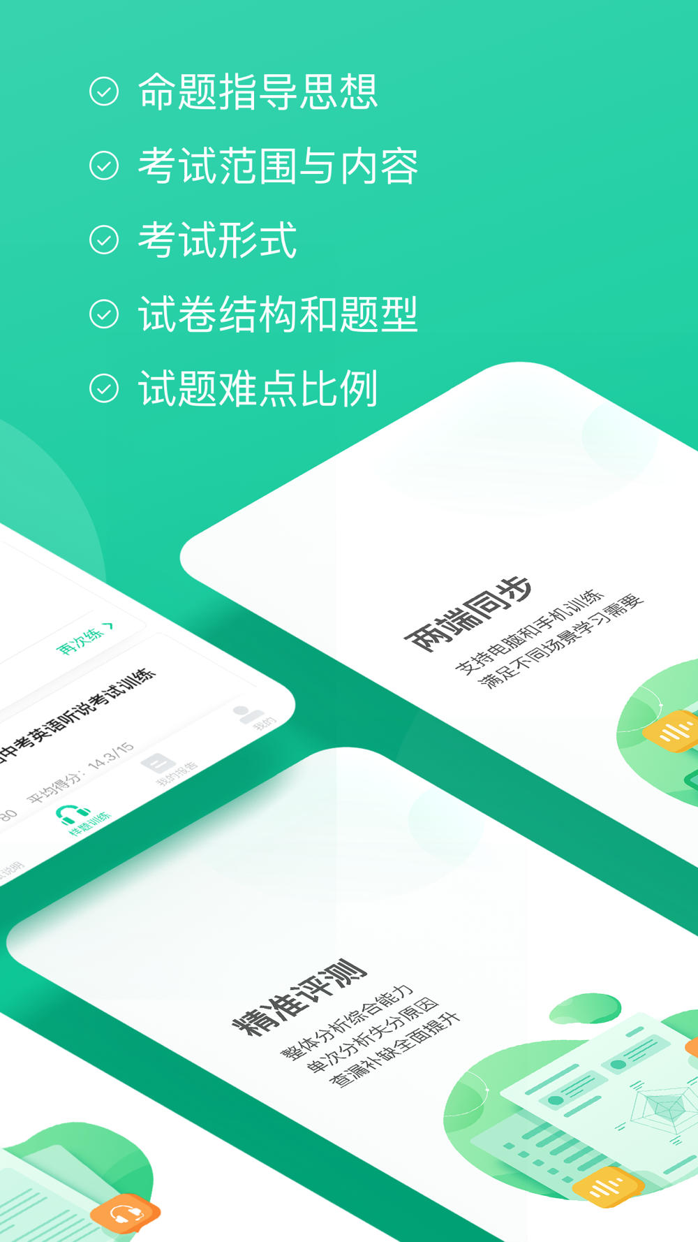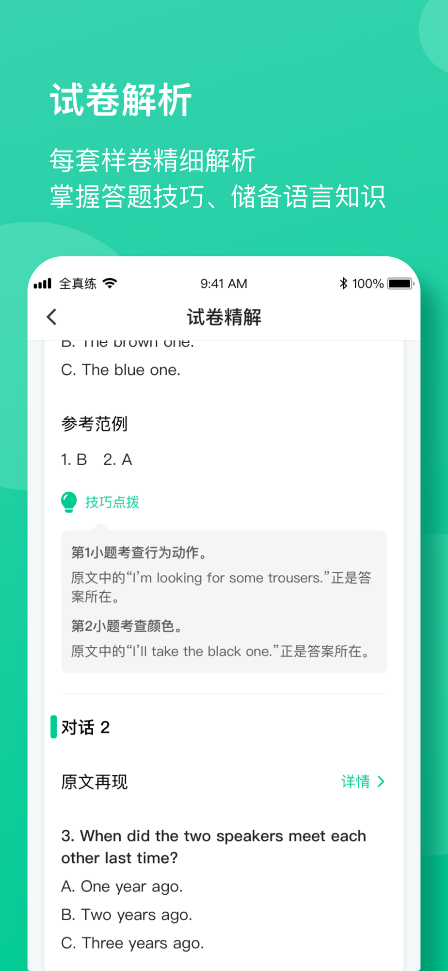 4.试卷精解:针对每一套样题的试卷内容解析。考生认真完成训练后,可以查看到所练试卷的内容解析,包括知识点、考查点、答题技巧详解和背景知识等,教会考生举一反三,高效提升听说能力。