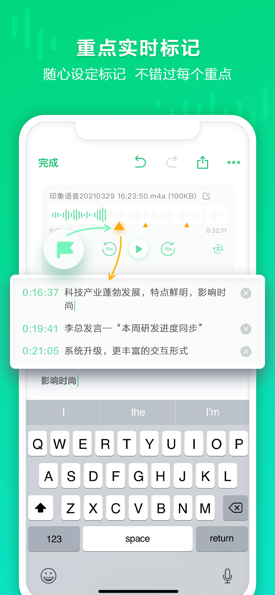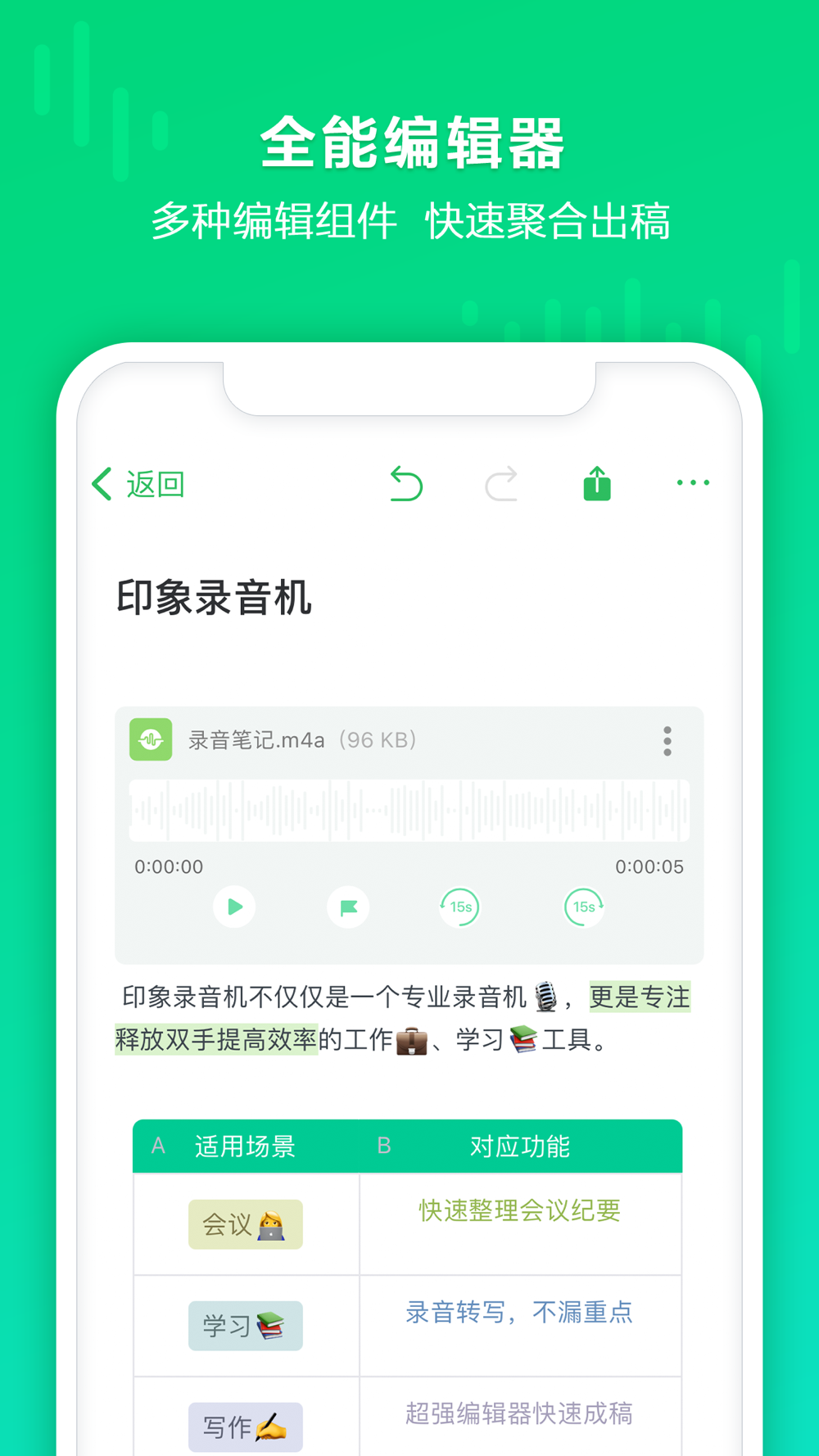 印象录音机不仅仅是一个专业录音机,更是专注释放双手提高专注度的工作、学习提效App。实时录音转写高准确率,同时有多功能编辑器辅助提效,帮助你快速编辑出稿。