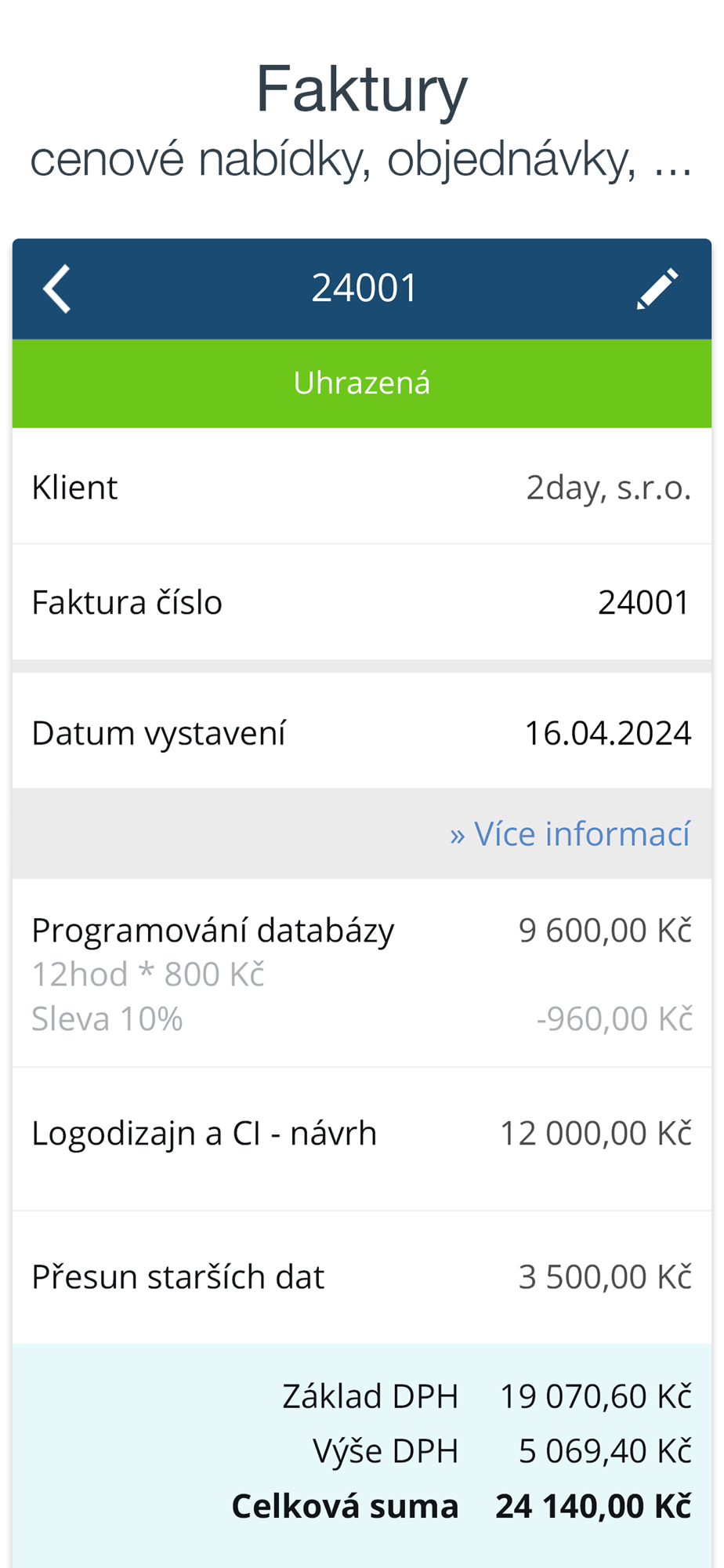 Podpora pro českou i slovenskou legislativu. SuperFaktura je řešením pro živnostníky a malé firmy, které hledají jednoduchý online ekonomický systém. Kromě faktur v ní můžete vystavovat i cenové nabídky, objednávky, dodací listy,... Mobilní verze, propojená na komplexní webovou aplikaci, vám poskytne možnost rychlého vystavení dokladu a mít přístup k přehledům aplikace.
