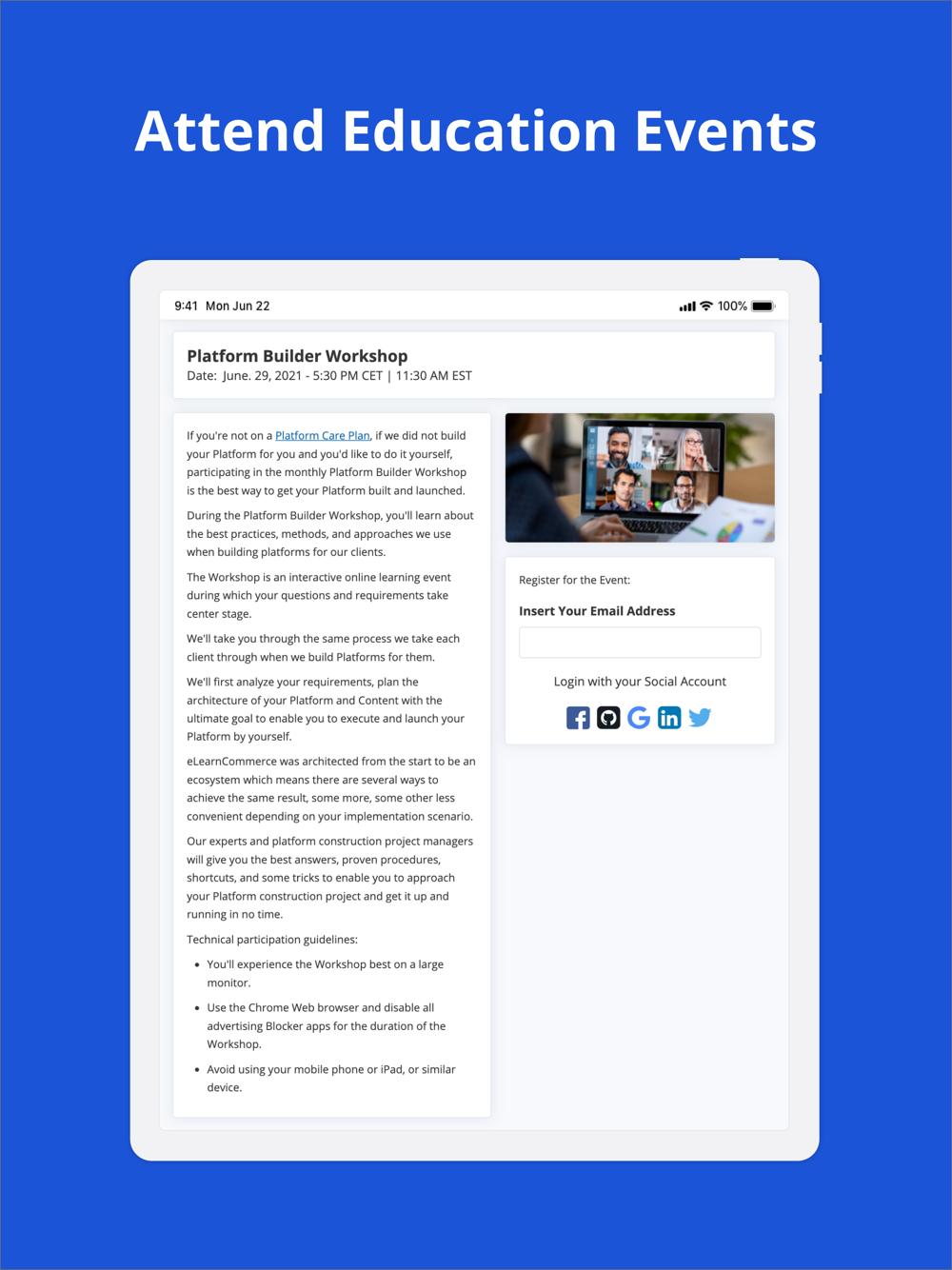 The eLearnCommerce Mobile App allows you to access relevant content & conversations quickly, speak to your Platform Project Manager while on the go, keep track of progress, participate in online workshops and webinars, access content and courses, your invoices, upgrade the status of your service, and so much more.