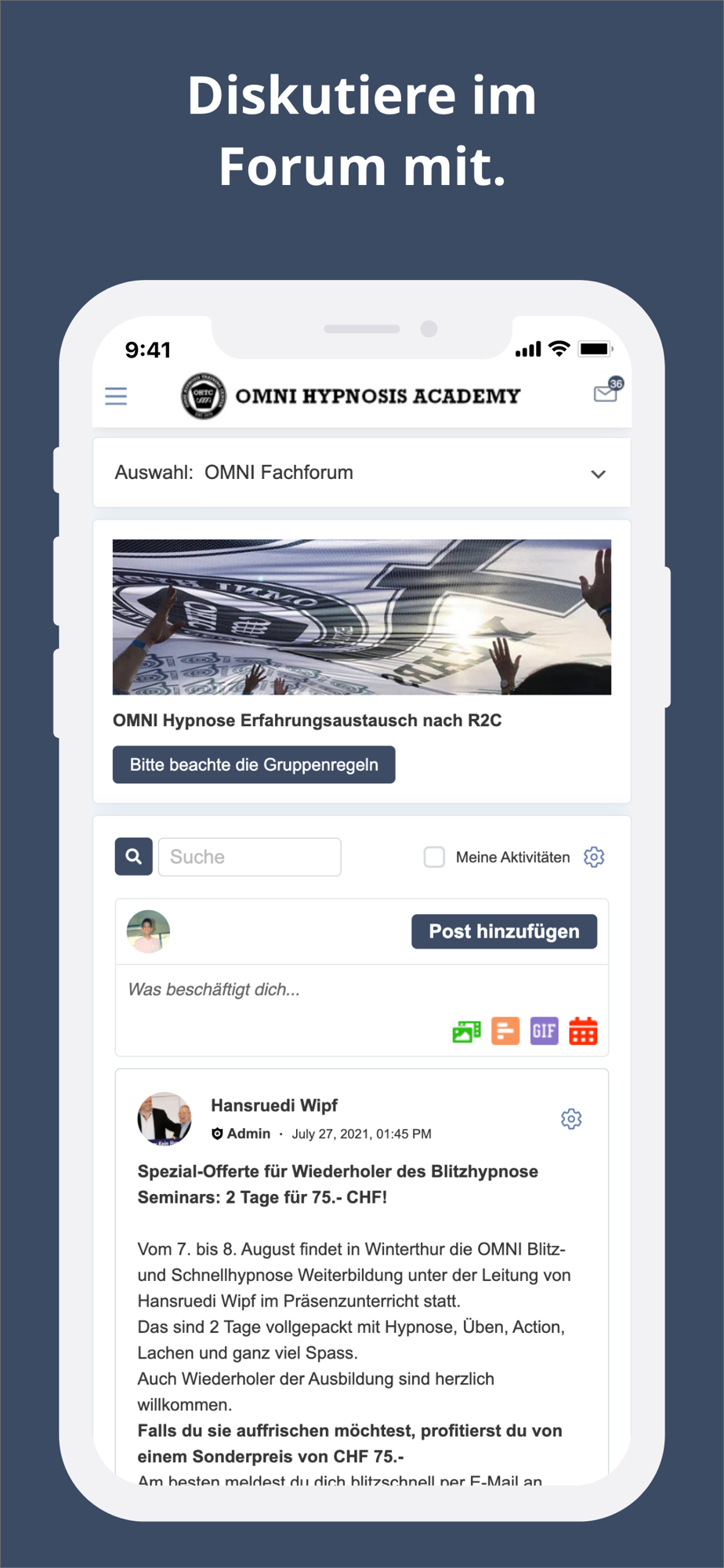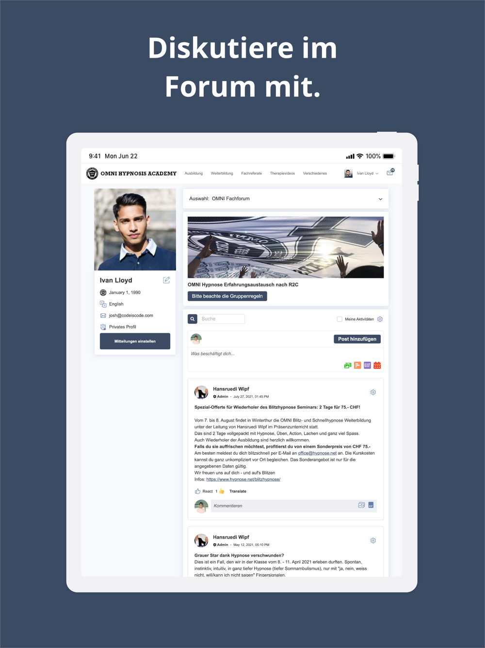 Mit der OMNI Hypnosis App kannst du schnell auf alle relevanten Inhalte und Konversationen zugreifen, von unterwegs den Support kontaktieren, an Webinaren teilnehmen, auf gekaufte Aus- und Weiterbildungen sowie Fachreferate zugreifen, dein Profil aktualisieren, an Diskussionen im Forum teilnehmen und vieles mehr.