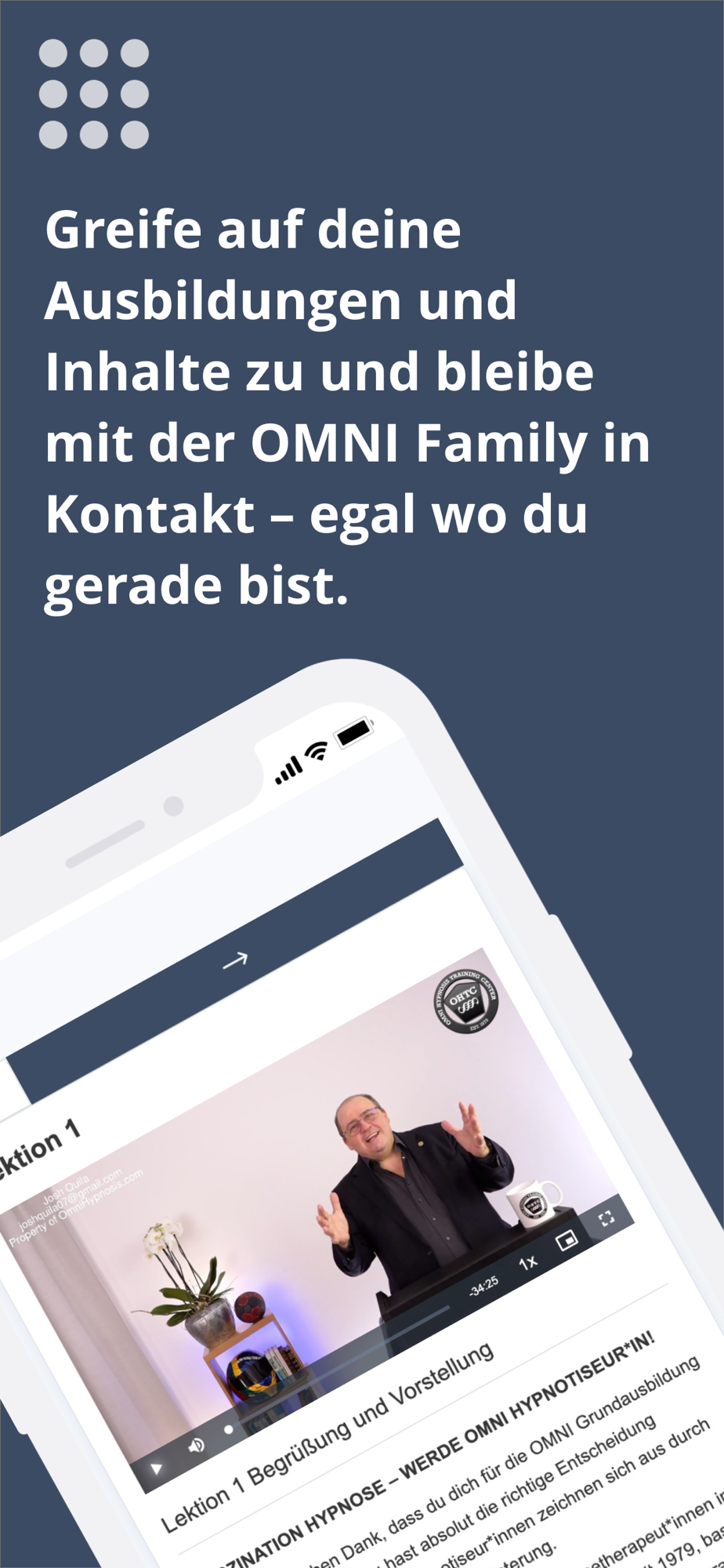 Die OMNI Hypnosis App ermöglicht dir den Zugang zu all deinen Inhalten und Ausbildungen, während du unterwegs bist. Beteilige dich mit einem Klick an den Diskussionen im Forum, schau dir unsere Webinare und Therapievideos an oder lerne weiter egal wo du gerade bist.