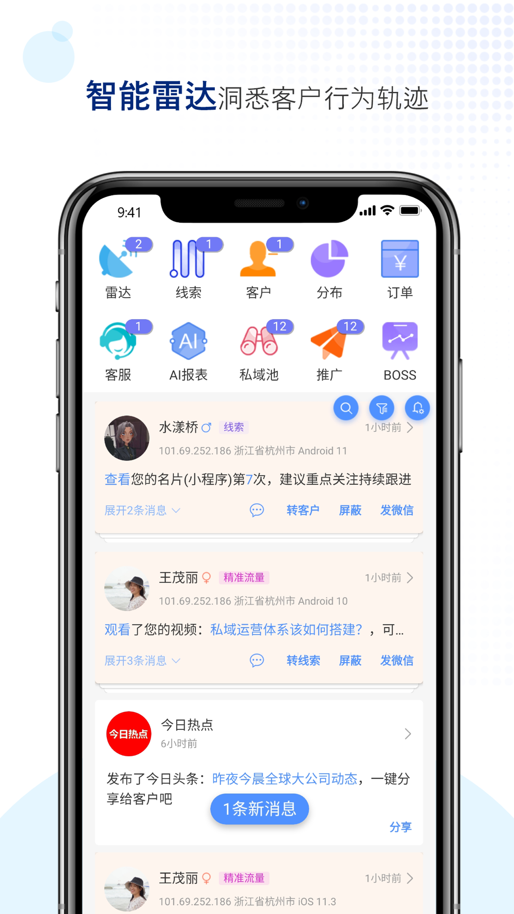 AI名片营销系统,多维度社交名片打造专业形象吸引客户,9大营销物料实现品牌生意大曝光,智能雷达洞悉客户行为轨迹,SCRM客户管理系统对每个客户进行跟进和标签,实现颗粒级管理和运营。