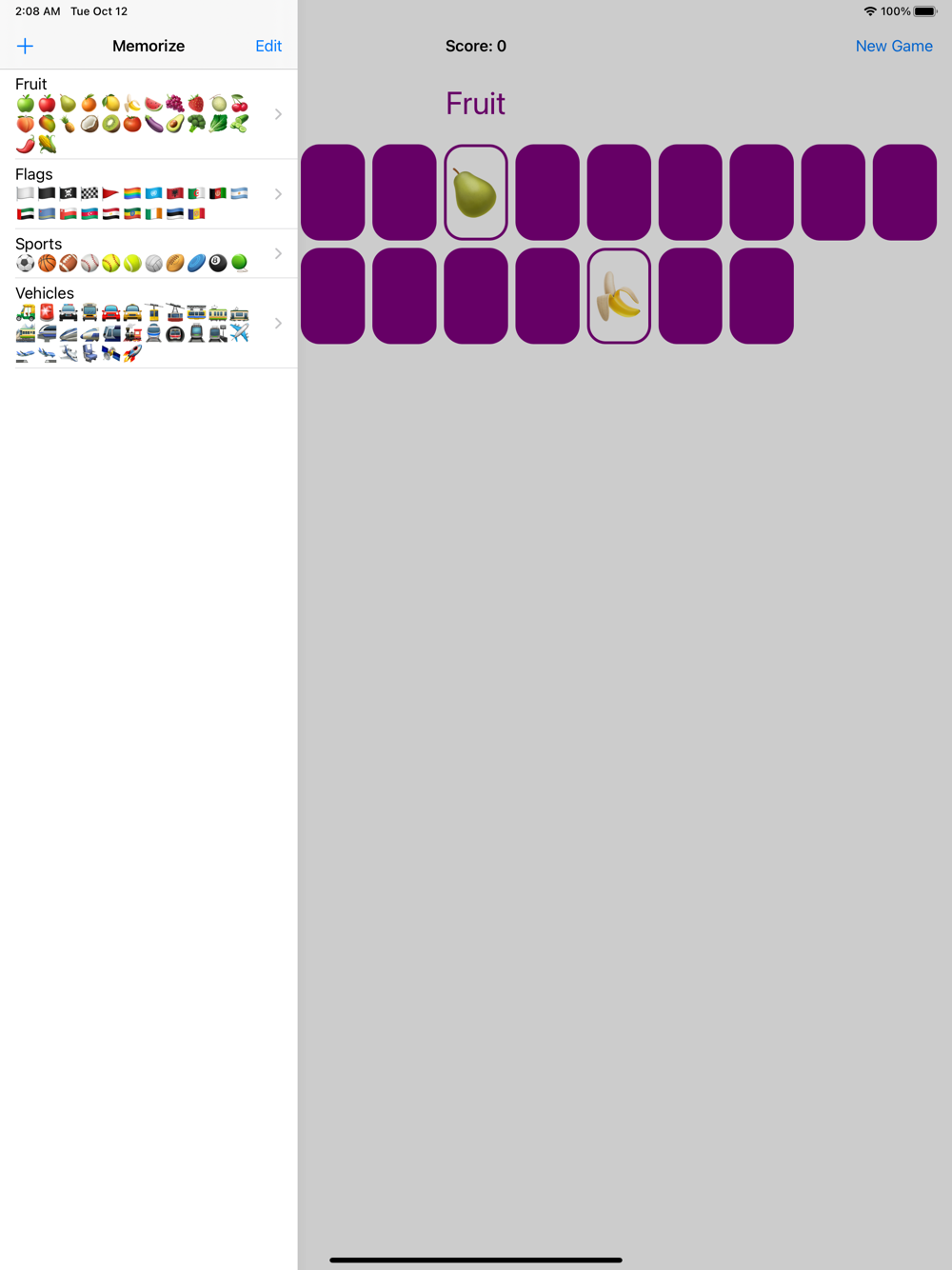 MemorizeEmoji is a Card Matching game. These cards have emoji on them. You click on cards and they flip over and you are trying to match them. If you find a match, you gain point. Point shows in the game by penalizing 1 point for every previously seen card that is involved in a mismatch and giving 2 points for every match whether or not the cards involved have been “previously seen”.