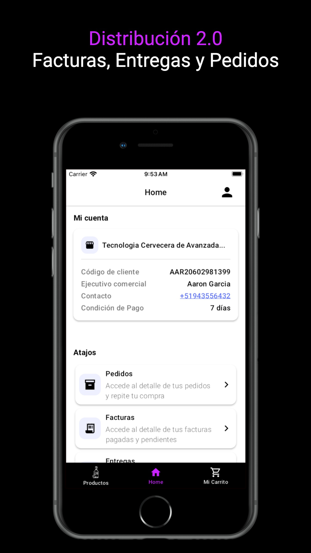 Nuestro aplicativo móvil se organiza en categorías de bebidas. Tu información de contacto, así como las direcciones de destino, ya estarán pre cargadas.