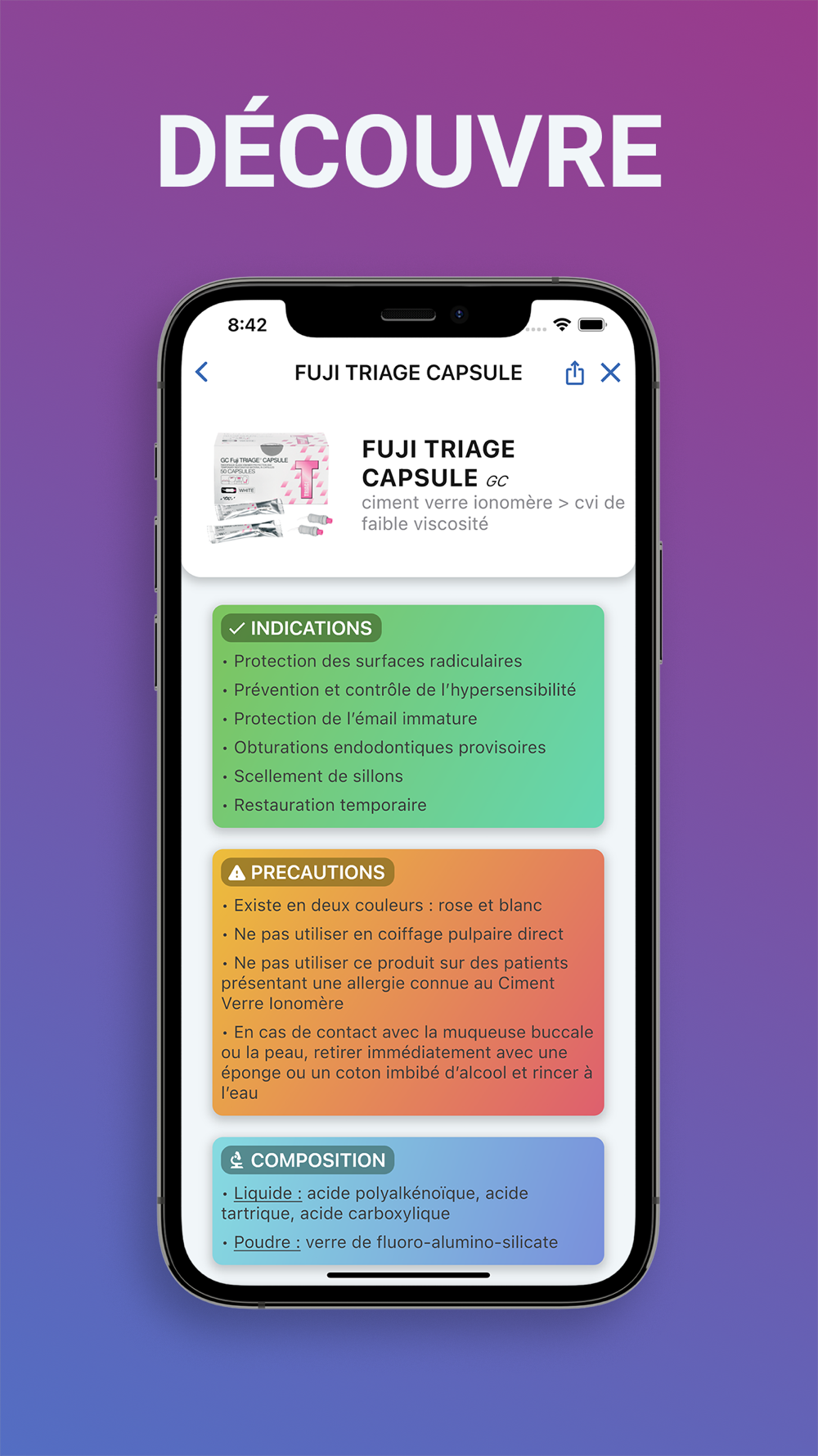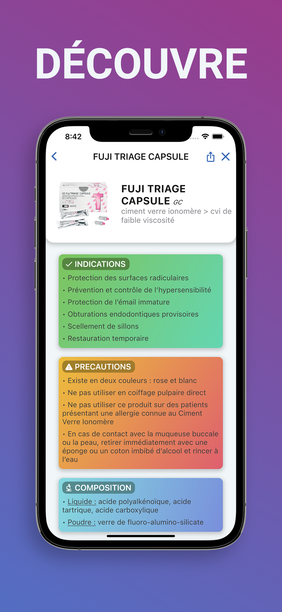 Chaque fiche produit comprend des informations sur les propriétés, indications, précautions, contre-indications, composition, protocole d'utilisation et plus encore. Tu peux également télécharger le mode d'emploi du produit directement depuis l'application afin de toujours avoir à portée de main les instructions les plus exhaustives.