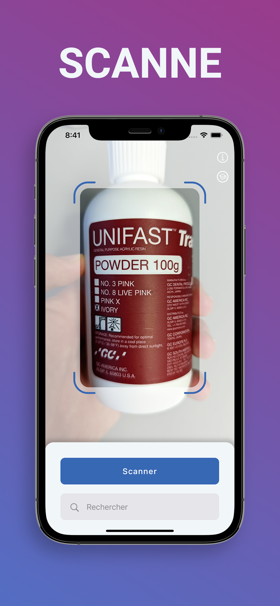 Grâce à son puissant moteur de recherche intégré, tu trouveras le produit que tu cherches en quelques secondes. Il suffit de saisir le nom du produit ou son indication d'utilisation pour accéder à sa fiche produit détaillée. Et si tu préfères un moyen encore plus rapide pour trouver les informations sur un produit, utilises la fonctionnalité de scan d'étiquette !