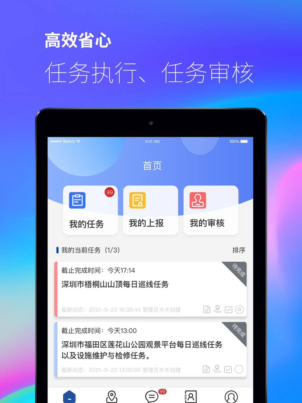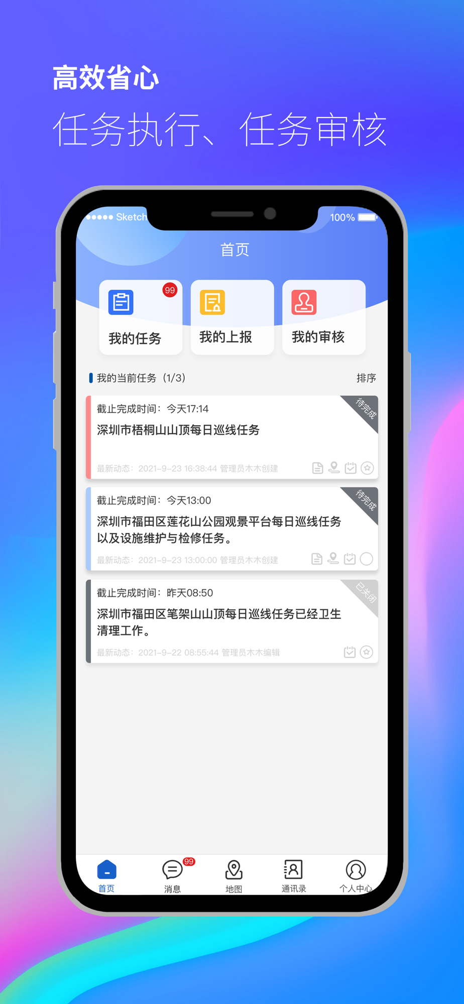 本APP完整保留了“两步路户外助手”的工具性,额外添加了包括任务完成、任务审核、公司组织框架、紧急上报等功能。