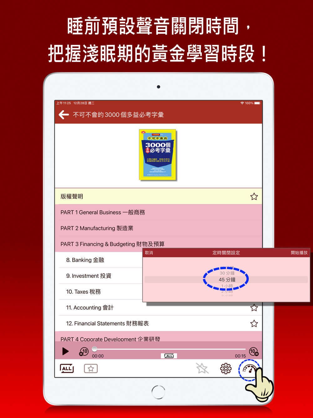 ● 可設定播放時間,讓您睡前也能預設關閉時間,把握淺眠期的黃金學習時段。