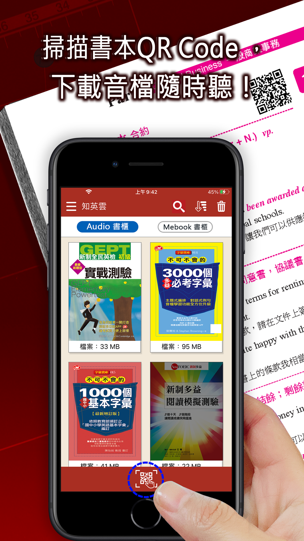 ● App 內建掃描器,掃描書本內頁QR Code ,可直接對應到書本內容,播放音檔。