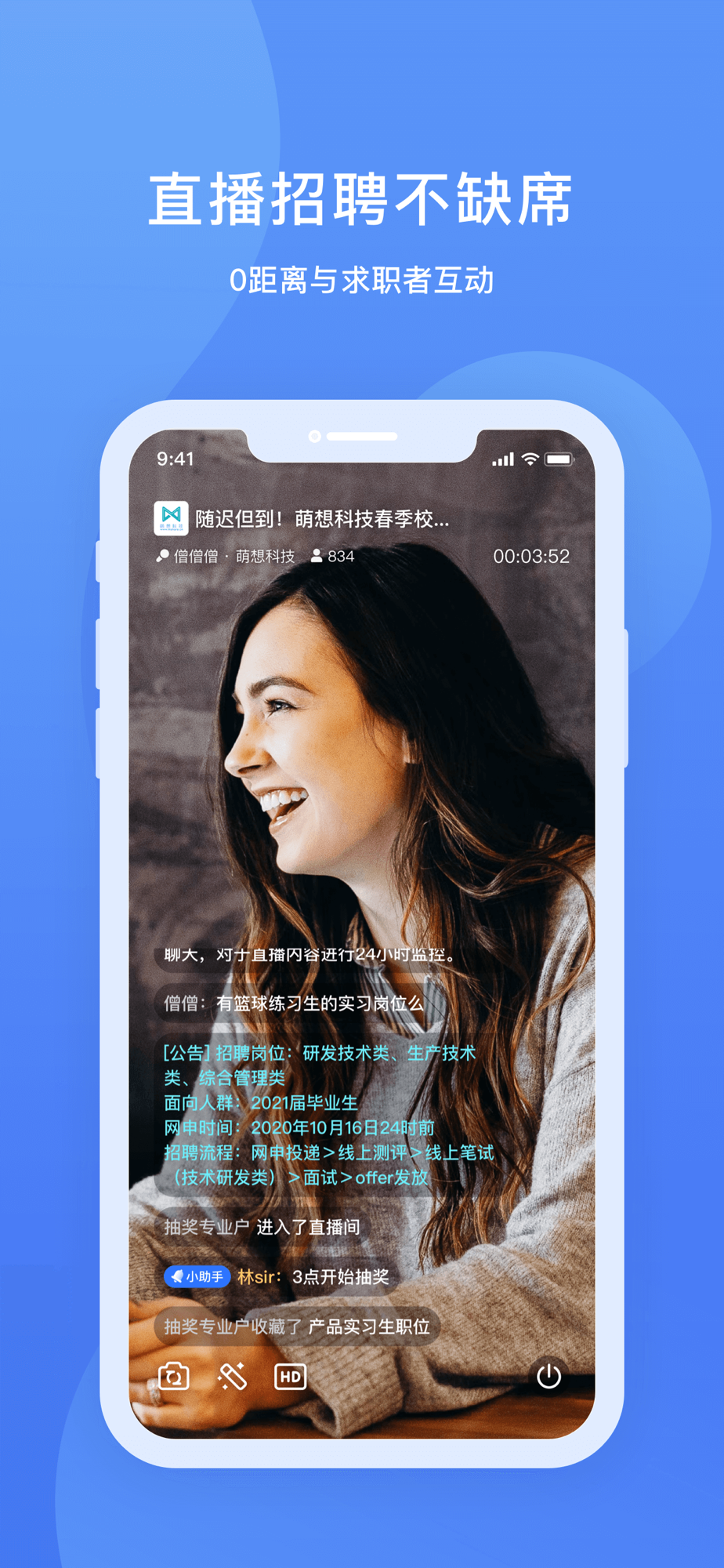 实习僧招聘端致力于让企业招聘更简单、更高效,为企业提供快捷便利的线上直播工具,一键即可开播,帮助企业快速沉淀人才资源。