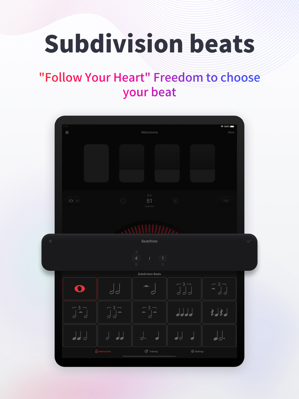 - A variety of different beats, notes, and 15 subdivision beats to choose from;