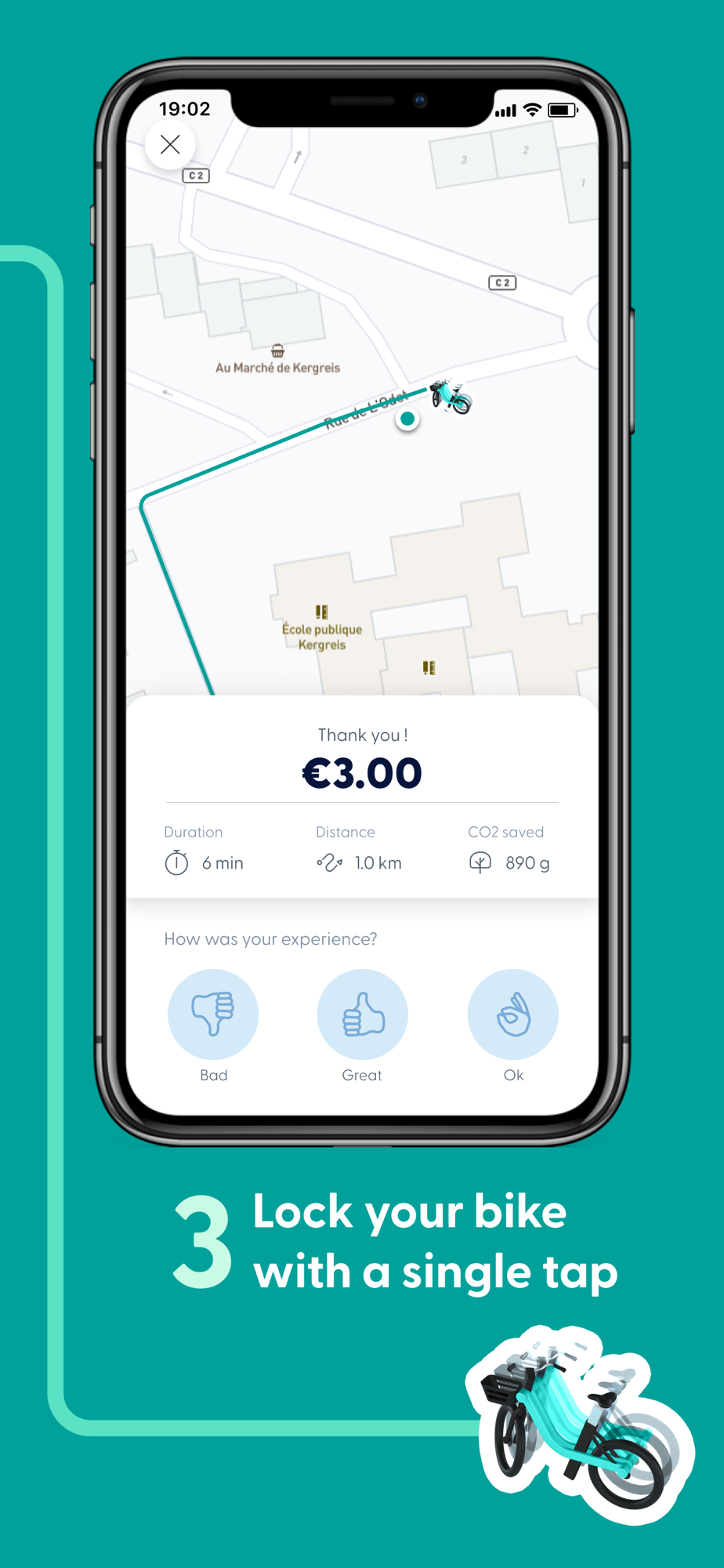 Head over to the Vélo'Baie app to end your trip and lock the bike or by using your KorriGo card. It’s now ready to be used by another user!