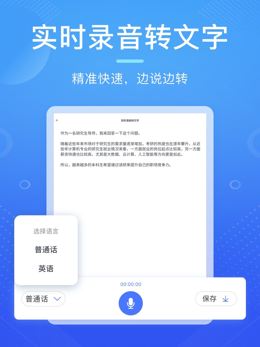 支持普通话和英语两种模式的实时录音转文字、录音识别、语音识别等,精准快速,边说边转。