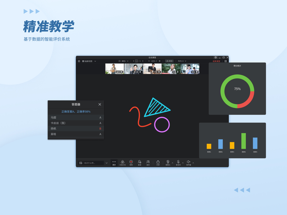 更好服务教学过程:深入打磨白板、录制、屏幕共享、文件共享等教学内容呈现相关模块,灵活满足各种教学法的落地。