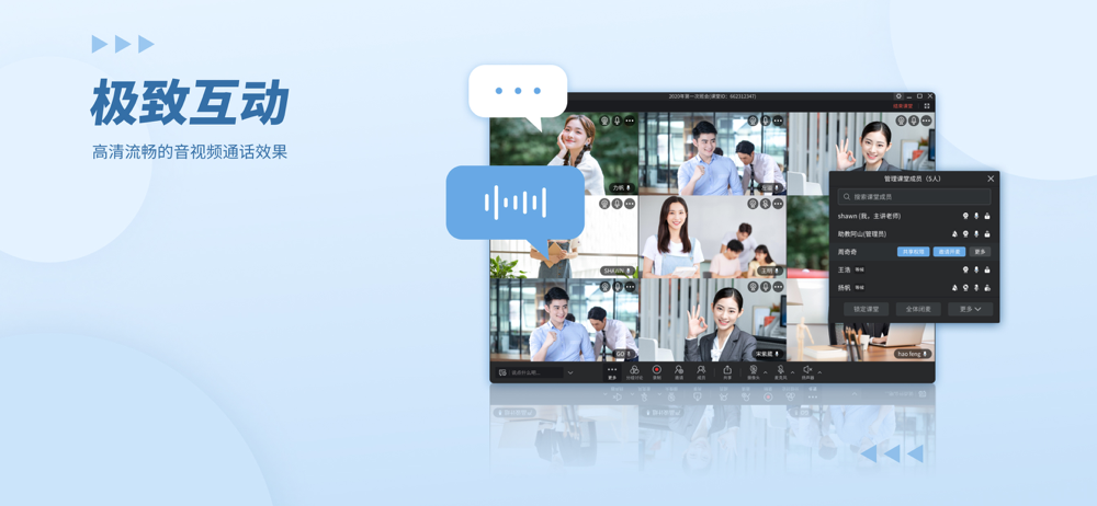 支持教师教学管理:支持考勤、设备控制,学生分组,一键下课等在线教学管理规范。