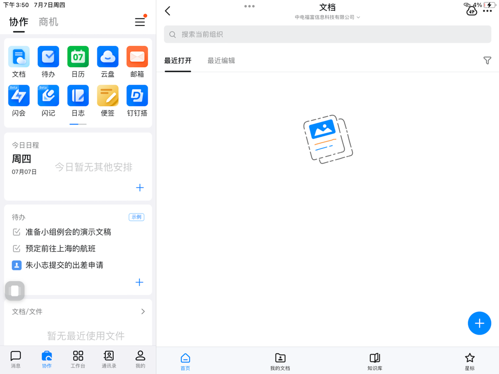 天翼钉功能包含即时通讯、视频会议、在线文档、云盘、智能审批、会议日程、通讯录。