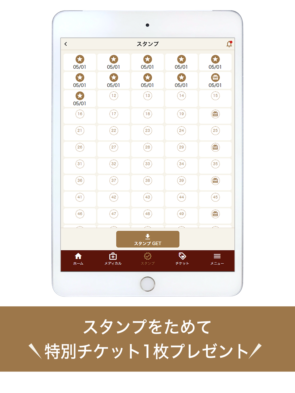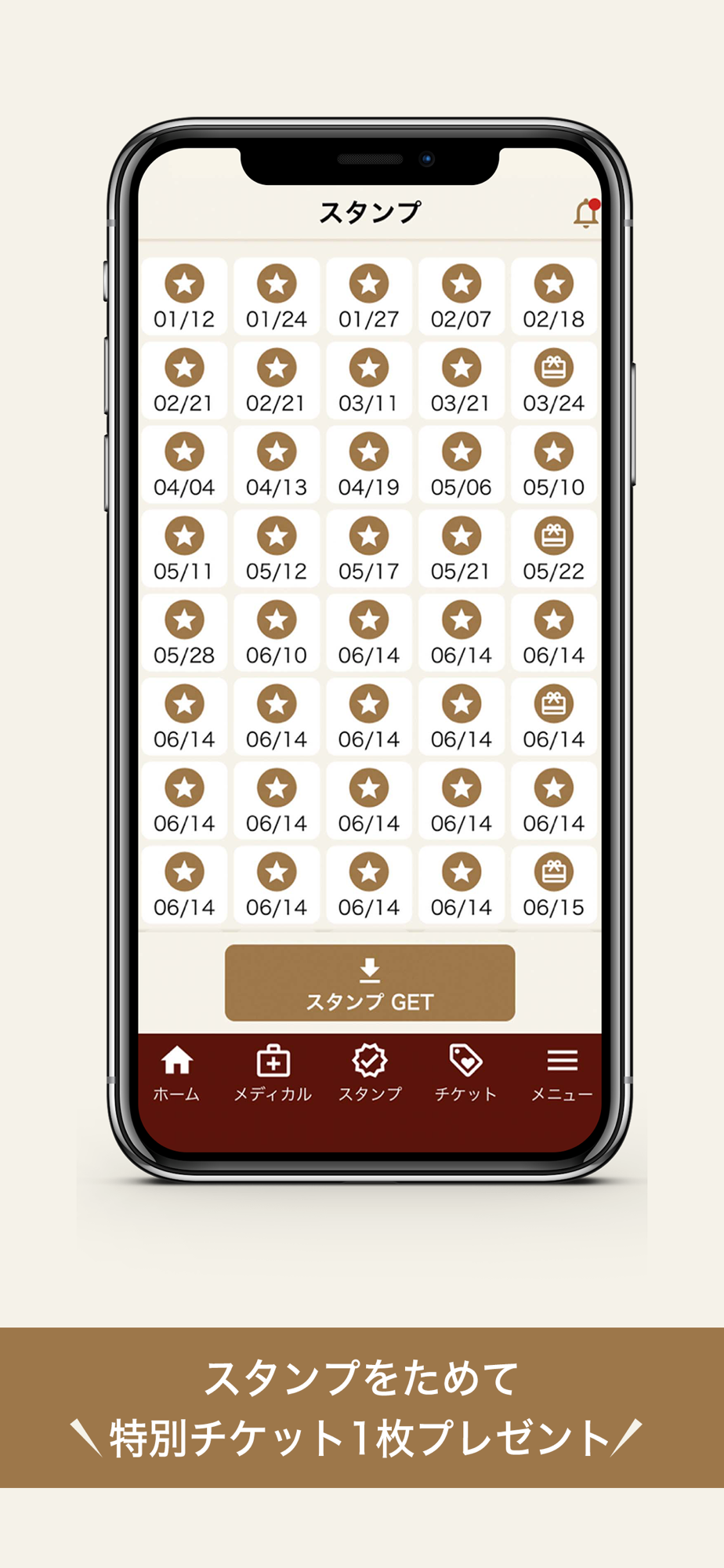 フィットネスジム来場ごとにスタンプを取得することができます。来場スタンプが貯まるとサービスチケットが発券されます。