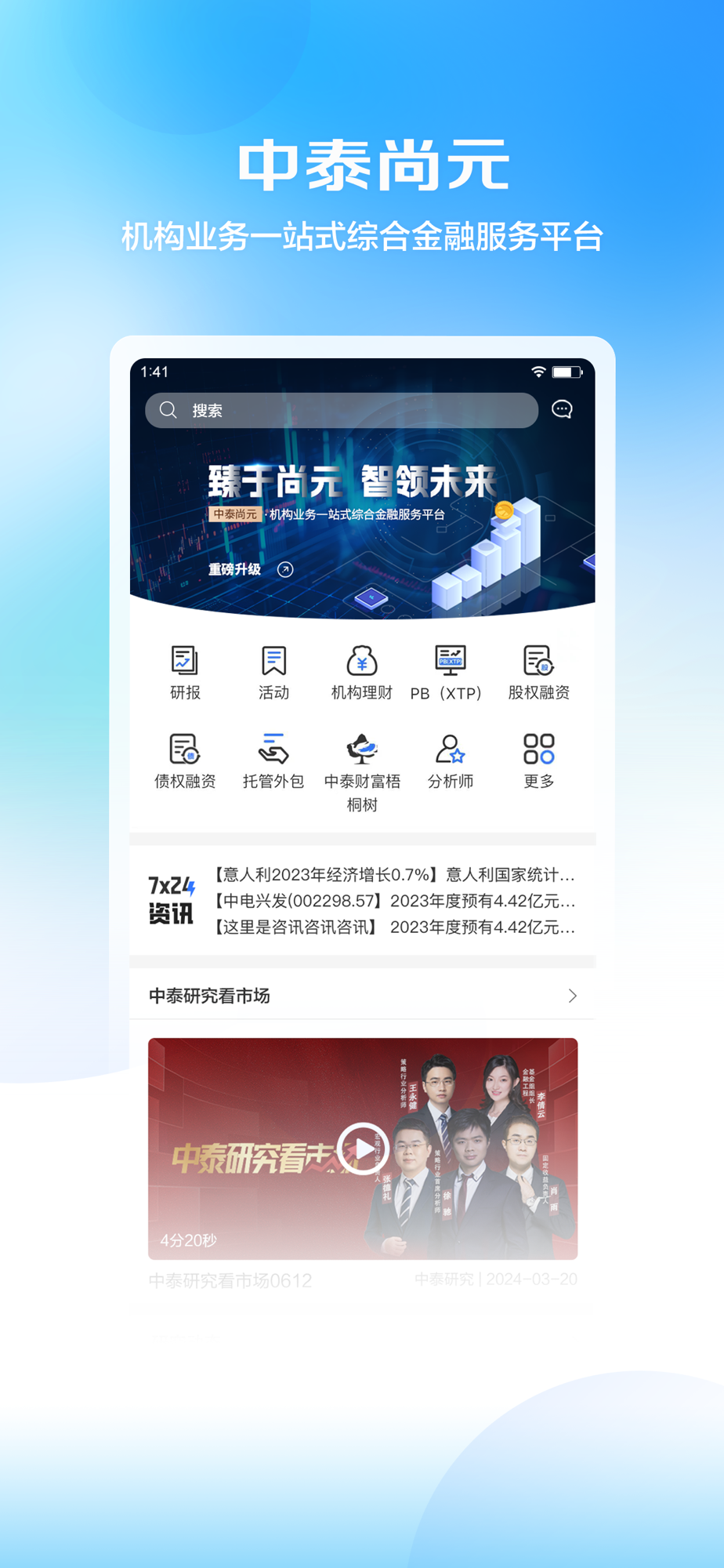 中泰尚元是中泰证券专门为机构客户打造的综合金融服务品牌,践行“臻于尚元,智领未来”的服务使命,通过全面整合服务资源,构建机构业务一站式综合金融服务平台,提供机构业务全场景服务。机构客户可在线获取最新业务资讯、进行业务沟通、完成数据查询、办理活动申请等常规操作。